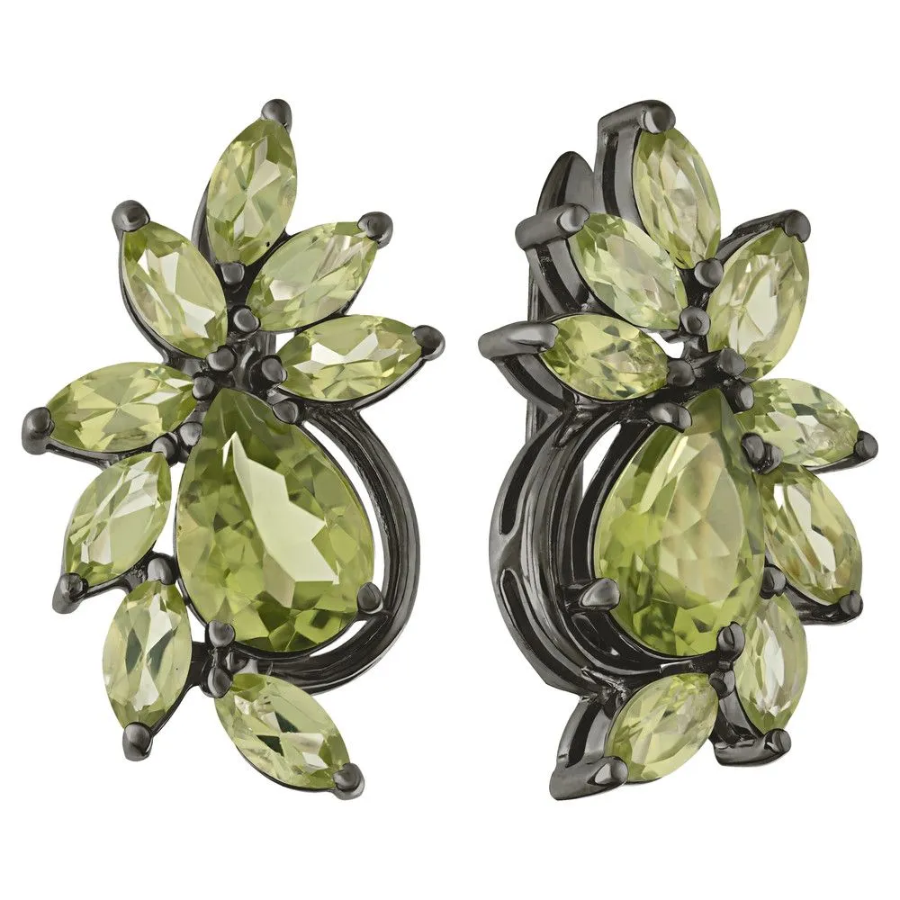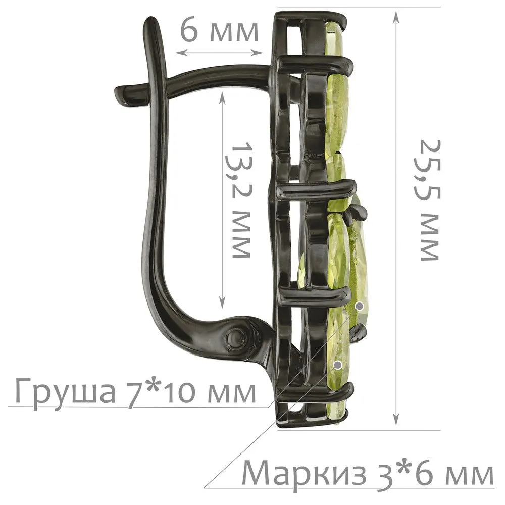 Серебряные серьги с натуральным хризолитом - коллекция Элегия / покрытие Черный Родий. Средний вес украшения с камнями 8.67 гр. Месторождение: Хризолит (Якутия, Россия) Ювелирные вставки: Хризолит (Натуральный) груша 7*10 мм., средний вес: 1.89 карат. Хризолит (Натуральный) маркиз 3*6 мм., средний вес: 0.25 карат. Все изделия собственного производства и имеют гарантию 12 месяцев. Арт. 8782BR . Хризолит – камень, который называют «вечерним изумрудом» за удивительную способность менять цвет в зависимости от освещения. Считается, что хризолит очень любила Клеопатра. Хризолитовый порошок используется для общего восстановления организма, для очищения пищи от ядов и токсинов и улучшения работы ЖКТ. Кроме того, минерал защищает от опасностей и укрепляет дружеские отношения.