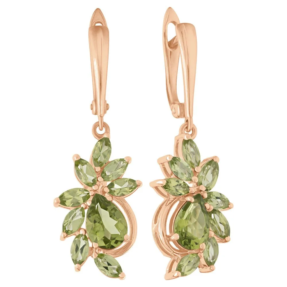 Серебряные серьги с натуральным хризолитом - коллекция Элегия / покрытие Красное золото. Средний вес украшения с камнями 7.88 гр. Месторождение: Хризолит (Якутия, Россия) Ювелирные вставки: Хризолит (Натуральный) груша 7*10 мм., средний вес: 1.89 карат. Хризолит (Натуральный) маркиз 3*6 мм., средний вес: 0.25 карат. Все изделия собственного производства и имеют гарантию 12 месяцев. Арт. 8784RG . Хризолит – камень, который называют «вечерним изумрудом» за удивительную способность менять цвет в зависимости от освещения. Считается, что хризолит очень любила Клеопатра. Хризолитовый порошок используется для общего восстановления организма, для очищения пищи от ядов и токсинов и улучшения работы ЖКТ. Кроме того, минерал защищает от опасностей и укрепляет дружеские отношения.