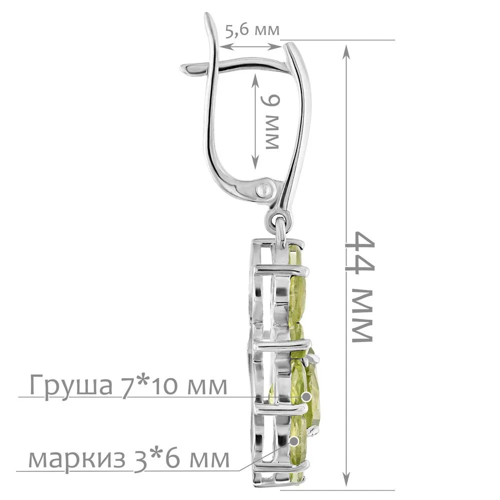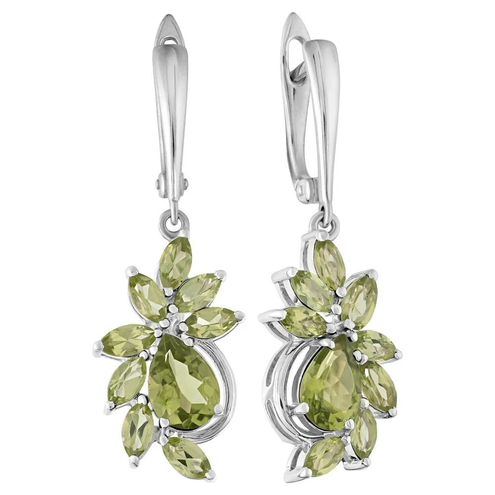Серебряные серьги с натуральным хризолитом - коллекция Элегия / покрытие Белый Родий. Средний вес украшения с камнями 7.88 гр. Месторождение: Хризолит (Якутия, Россия) Ювелирные вставки: Хризолит (Натуральный) груша 7*10 мм., средний вес: 1.89 карат. Хризолит (Натуральный) маркиз 3*6 мм., средний вес: 0.25 карат. Все изделия собственного производства и имеют гарантию 12 месяцев. Арт. 8784WR . Хризолит – камень, который называют «вечерним изумрудом» за удивительную способность менять цвет в зависимости от освещения. Считается, что хризолит очень любила Клеопатра. Хризолитовый порошок используется для общего восстановления организма, для очищения пищи от ядов и токсинов и улучшения работы ЖКТ. Кроме того, минерал защищает от опасностей и укрепляет дружеские отношения.