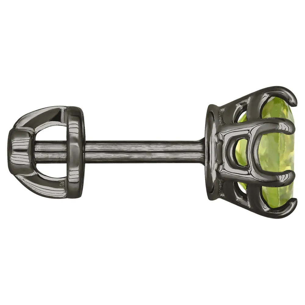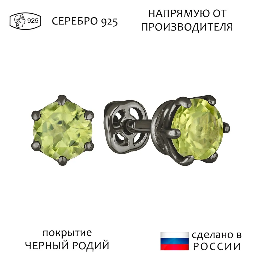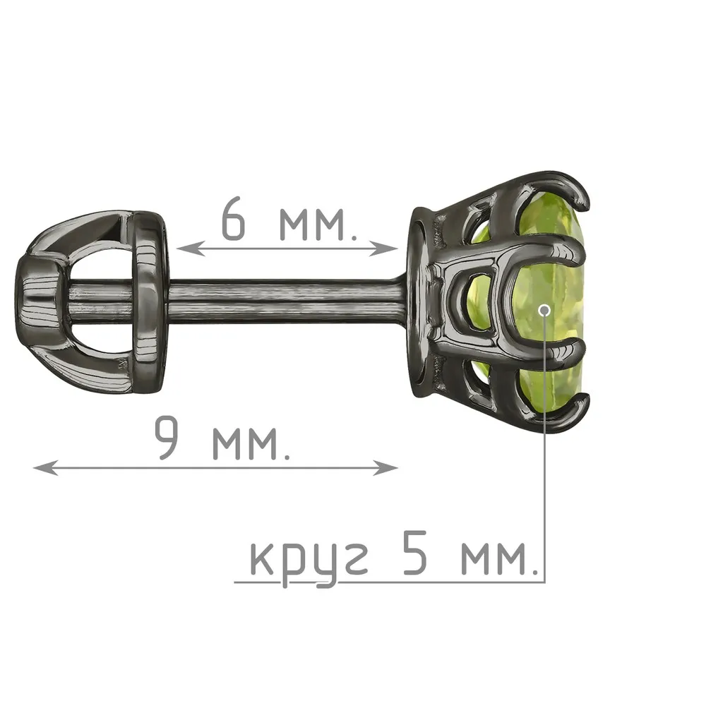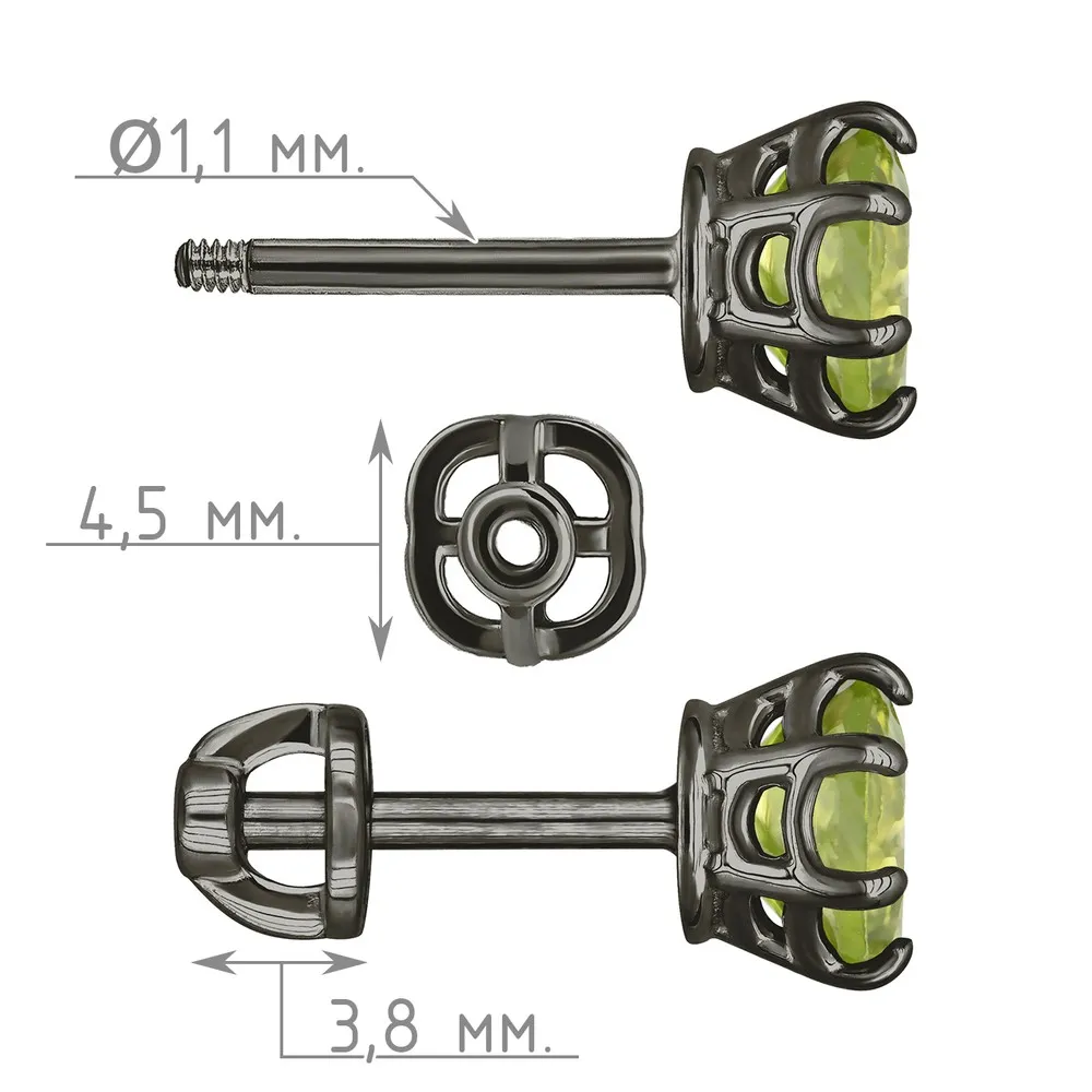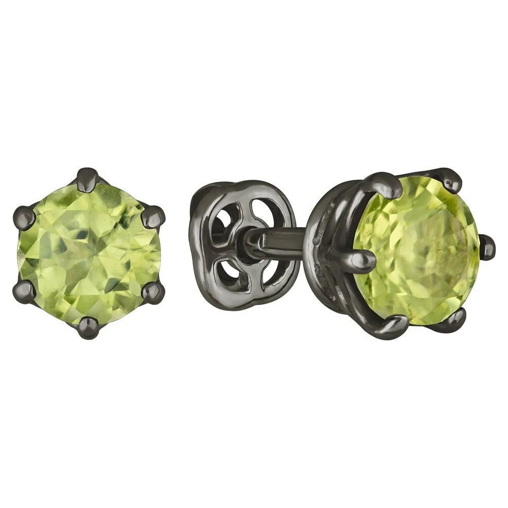 Серебряные серьги гвоздики (пусеты) с натуральным хризолитом 5 мм. / Черный Родий.