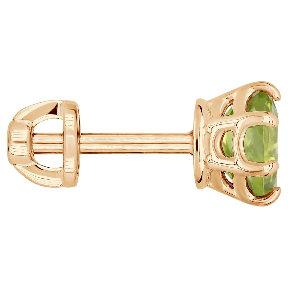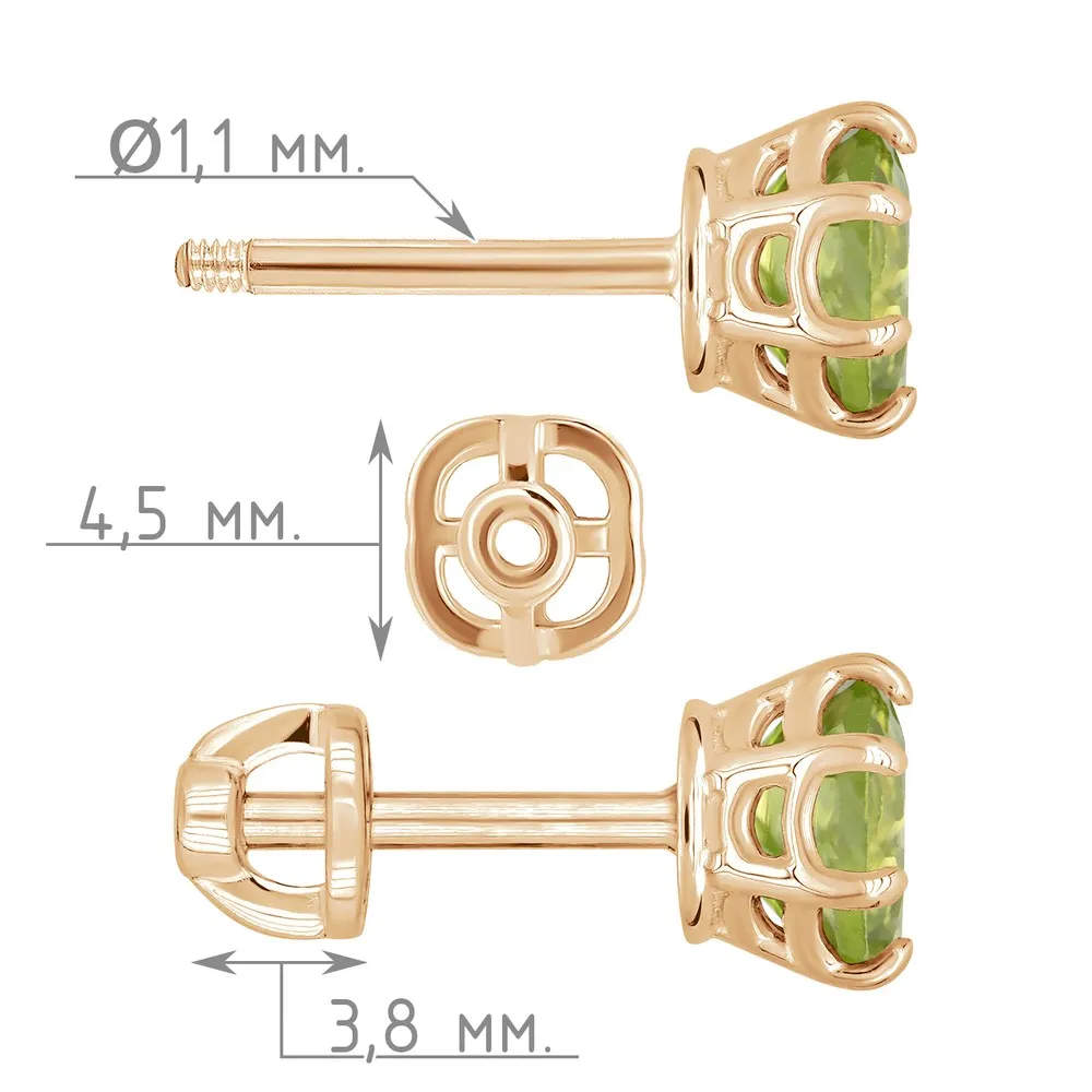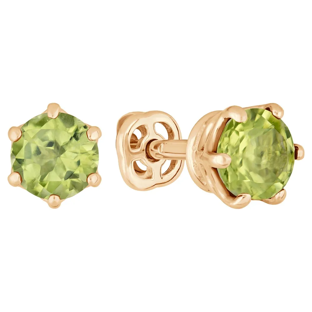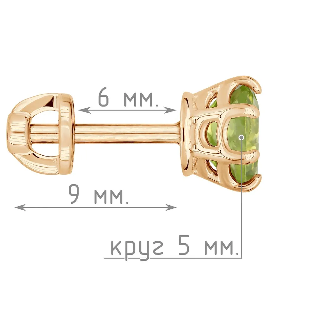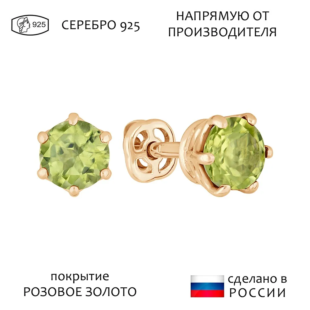 Серебряные серьги гвоздики (пусеты) с натуральным хризолитом 5 мм. / Розовое Золото.