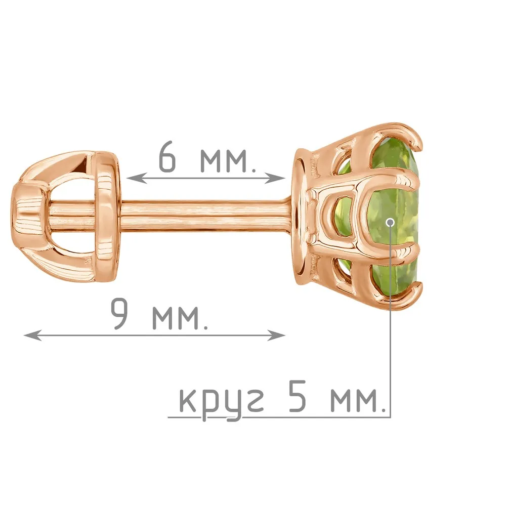 Серебряные серьги гвоздики (пусеты) с натуральным хризолитом 5 мм. / Красное золото.
