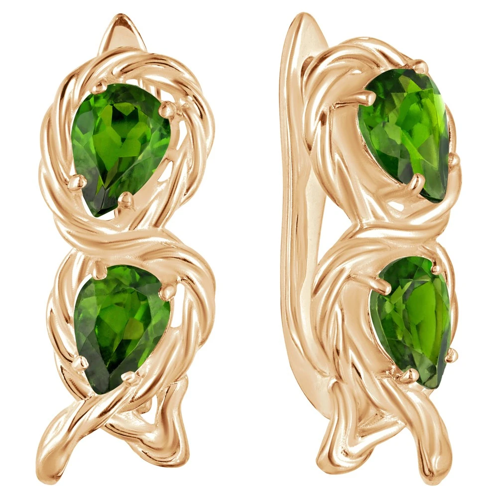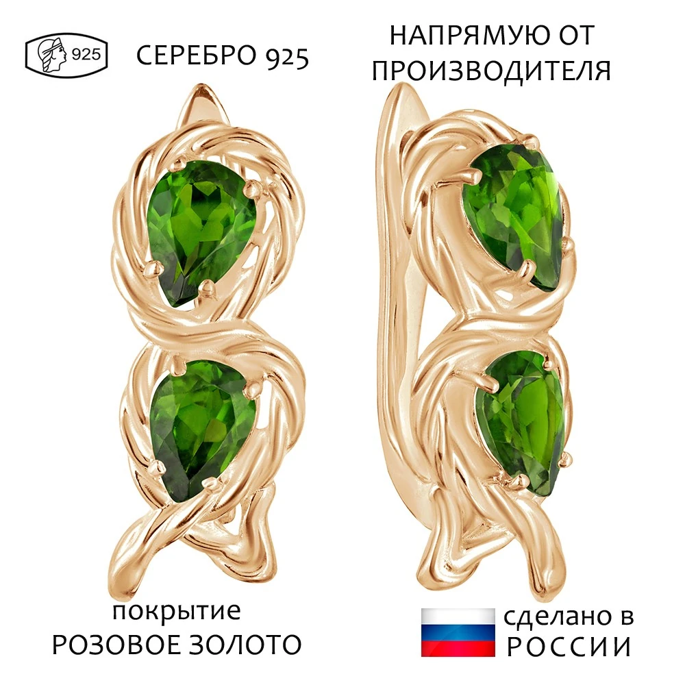 Серебряные серьги с натуральным хромдиопсидом - коллекция Ривьера. Серебряные серьги 925 пробы с покрытием розовое золото. Цвет покрытия соответствует швейцарскому цветовому стандарту NIHS -4N и цвету розового золота 585 в России. На последней фотографии мы разместили сравнительную фотографию 3 цвета золотого покрытия. Помимо предания золотого цвета Вашему изделию, тонкий слой золота защищает от окисления. Для более стойкого эффекта золочения и долговечности покрытия мы дополнительно наносим подслой палладия (Pd). Средний вес изделия с камнями 4.71 гр. Месторождение: Хромдиопсид (Якутия, Россия). Хромдиопсид (Натуральный) груша 5*7 мм., средний вес: 0.75 карат. Все изделия собственного производства. Гарантия 12 месяцев.Арт. 8195. Диопсид богат на оттенки, и именно за многоликость получил такое название. Камень очищает энергетическое поле человека от негатива, стимулирует работу сердца. Ценился мистиками и магами за целую гамму положительных качеств.