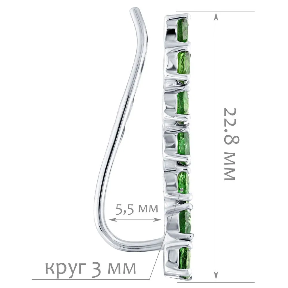 Серебряные серьги каффы с натуральным хромдиопсидом - коллекция Волна / покрытие Чистое Серебро.Средний вес украшения с камнями 1.78 гр.Месторождение: Хромдиопсид (Якутия, Россия)Ювелирные вставки:Хромдиопсид (Натуральный) круг 3 мм., средний вес: 1.04 карат.Все изделия собственного производства и имеют гарантию 12 месяцев. Арт. 8754AG . Диопсид богат на оттенки, и именно за многоликость получил такое название. Камень очищает энергетическое поле человека от негатива, стимулирует работу сердца. Ценился мистиками и магами за целую гамму положительных качеств.