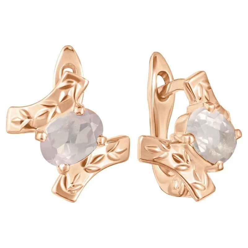 Серебряные серьги с натуральным розовым кварцем - коллекция Тея. Серебряные серьги 925 пробы с покрытием красное золото. Цвет покрытия соответствует швейцарскому цветовому стандарту NIHS -5N и цвету красного золота 585 в России. На последней фотографии мы разместили сравнительную фотографию 3 цвета золотого покрытия. Помимо предания золотого цвета Вашему изделию, тонкий слой золота защищает от окисления. Для более стойкого эффекта золочения и долговечности покрытия мы дополнительно наносим подслой палладия (Pd). Средний вес изделия с камнями 3.59 гр. Месторождение: Розовый кварц (Приполярный Урал, Россия) Розовый кварц (Натуральный) овал 5*7 мм., средний вес: 0.9 карат. Все изделия собственного производства. Гарантия 12 месяцев.Арт. 8132. Розовый кварц – камень сердца. Такое название он получил за способность приносить умиротворение и любовь. Он дарит сочувствие и глубокое понимание гармонии мира. Не обделён он и лечебными свойствами. Это талисман для привлечения в жизнь глубоких чувств и обретения семейного счастья.