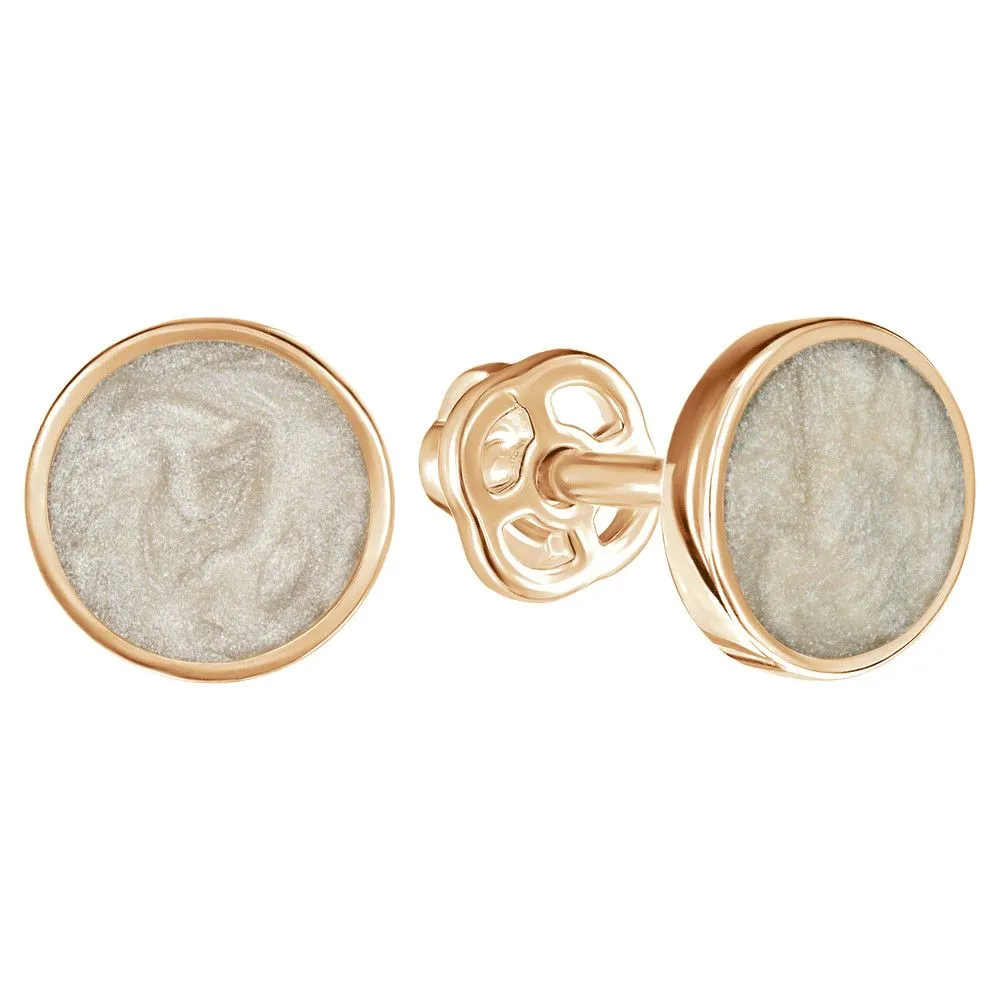 Серебряные серьги гвоздики (пусеты) с эмалью - цвет белый перламутр / Розовое Золото. Средний вес ювелирного украшения 1.27 гр. Эмаль – холодная двухкомпонентная итальянская эмаль высокого качества. Имеет высокую степень устойчивости к царапинам и солнечному свету, ударам и механическим повреждениям.< /p> Все изделия собственного производства и имеют гарантию 12 месяцев. Арт. 8589PG.