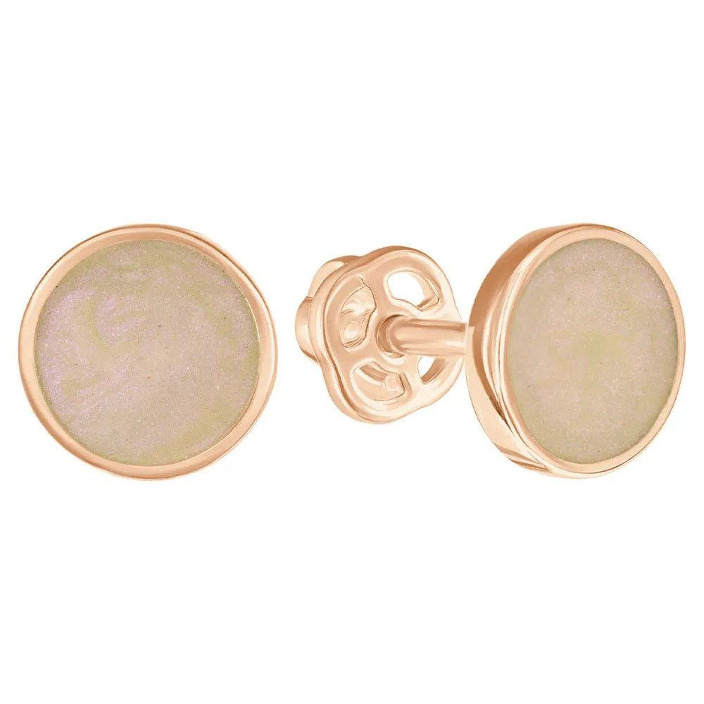 Серебряные серьги гвоздики (пусеты) с эмалью - цвет розовый перламутр / Красное золото. Средний вес ювелирного украшения 1.27 гр. Эмаль – холодная двухкомпонентная итальянская эмаль высокого качества. Имеет высокую степень устойчивости к царапинам и солнечному свету, ударам и механическим повреждениям.< /p> Все изделия собственного производства и имеют гарантию 12 месяцев. Арт. 8591RG.