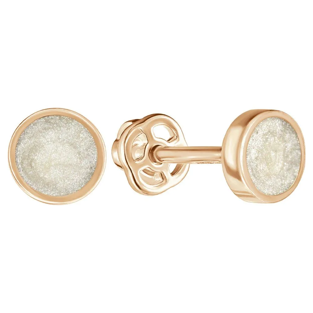 Серебряные серьги гвоздики (пусеты) с эмалью - цвет белый перламутр / Розовое Золото. Средний вес ювелирного украшения 0.86 гр. Эмаль – холодная двухкомпонентная итальянская эмаль высокого качества. Имеет высокую степень устойчивости к царапинам и солнечному свету, ударам и механическим повреждениям.< /p> Все изделия собственного производства и имеют гарантию 12 месяцев. Арт. 8605PG.