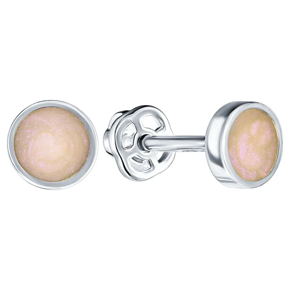 Серебряные серьги гвоздики (пусеты) с эмалью - цвет розовый перламутр / Чистое Серебро. Средний вес ювелирного украшения 0.86 гр. Эмаль – холодная двухкомпонентная итальянская эмаль высокого качества. Имеет высокую степень устойчивости к царапинам и солнечному свету, ударам и механическим повреждениям.< /p> Все изделия собственного производства и имеют гарантию 12 месяцев. Арт. 8607AG.