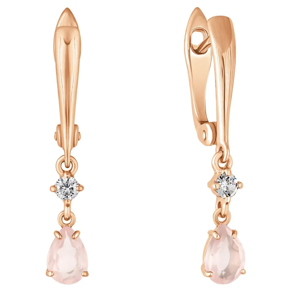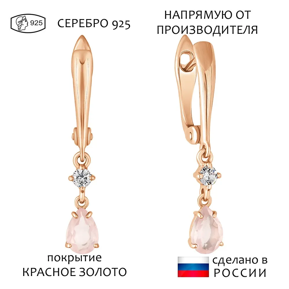 Серебряные серьги с натуральным розовым кварцем - коллекция Алсу (малая) / Красное золото.