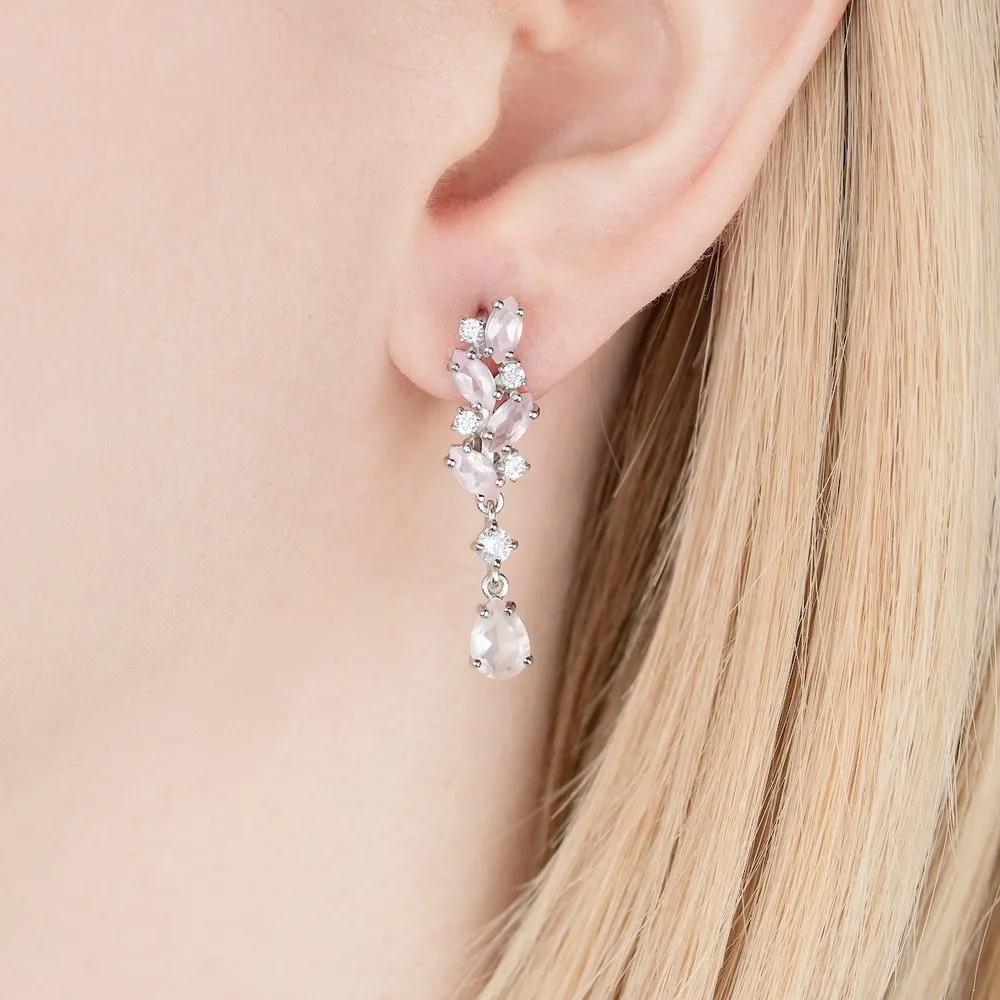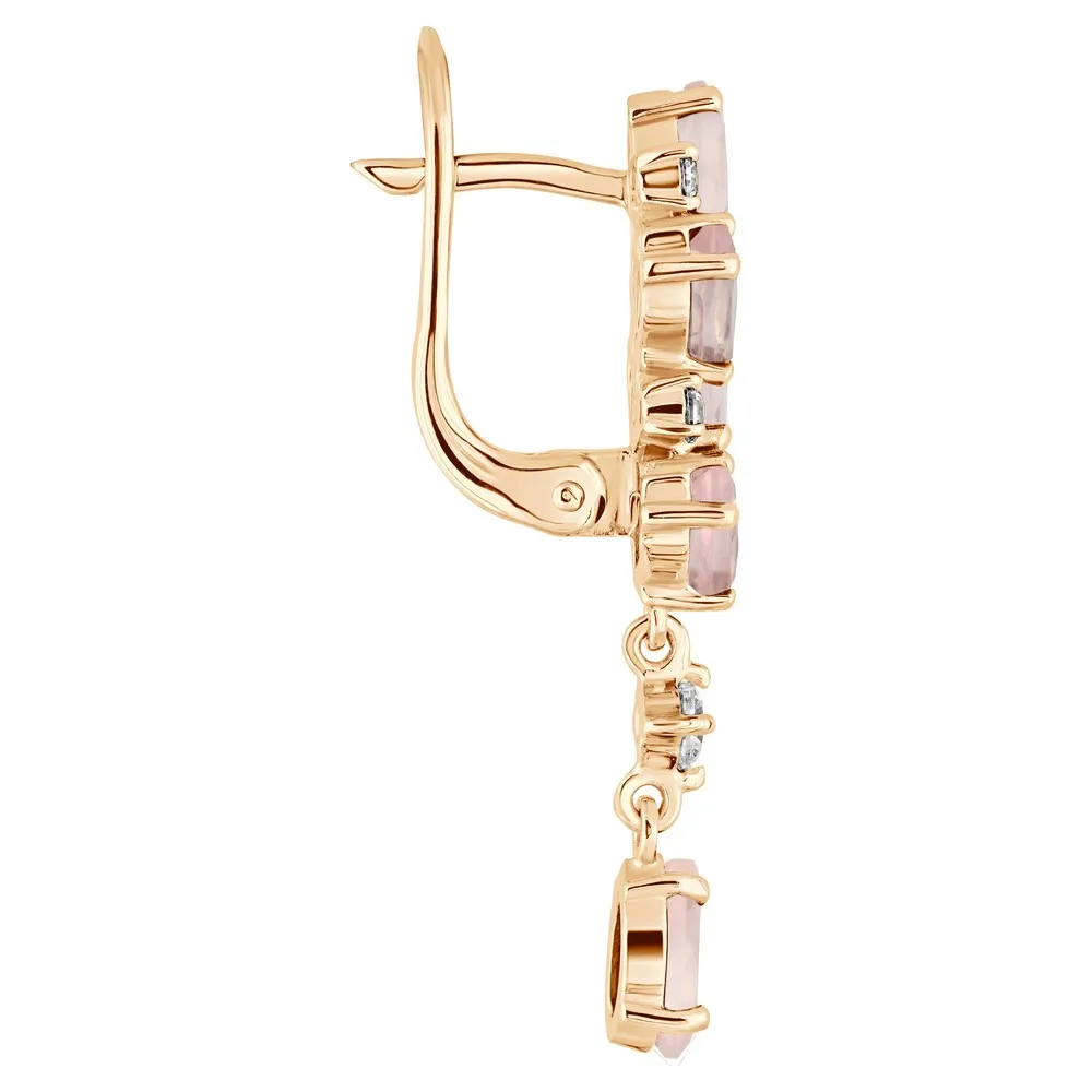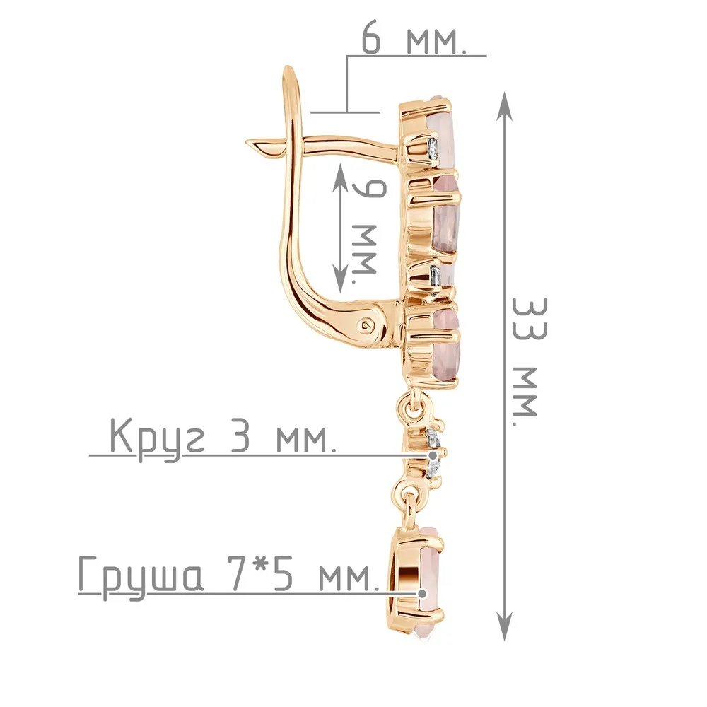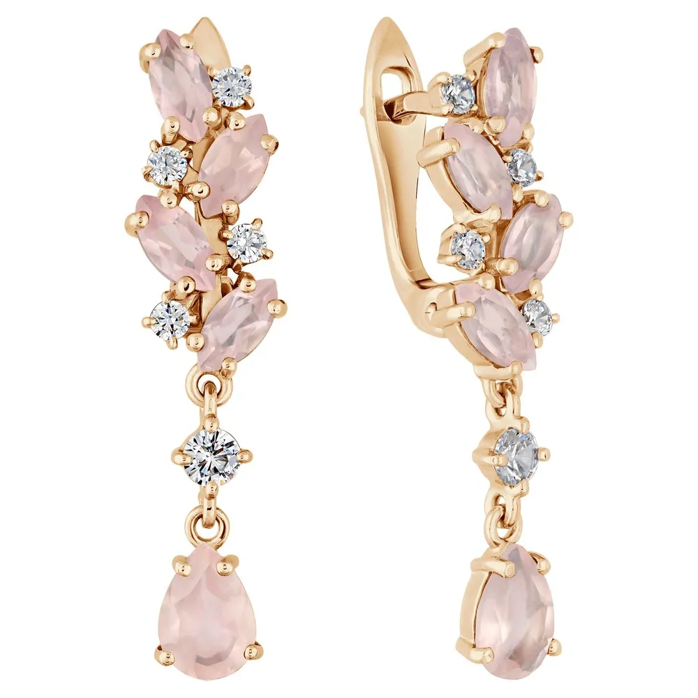 Серебряные серьги с натуральным розовым кварцем - коллекция Росинка / Розовое Золото.