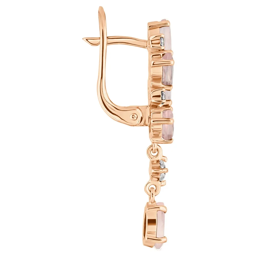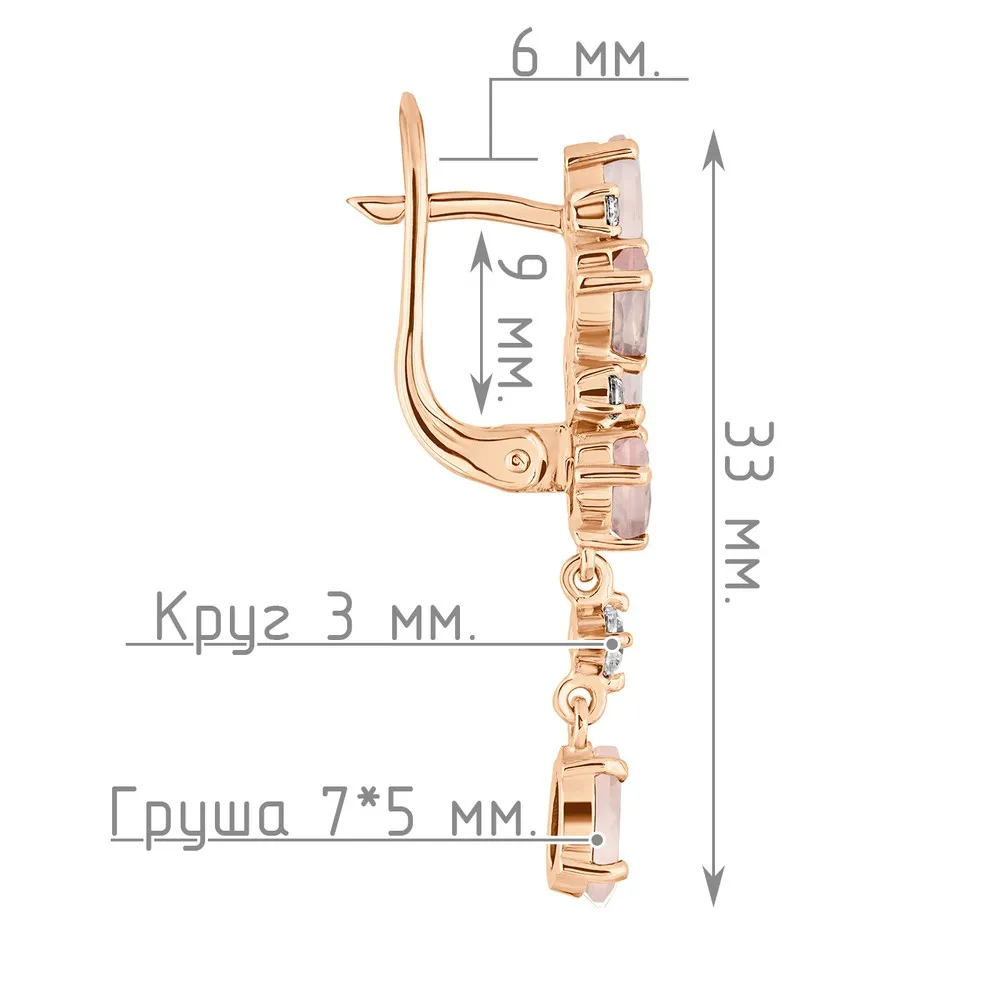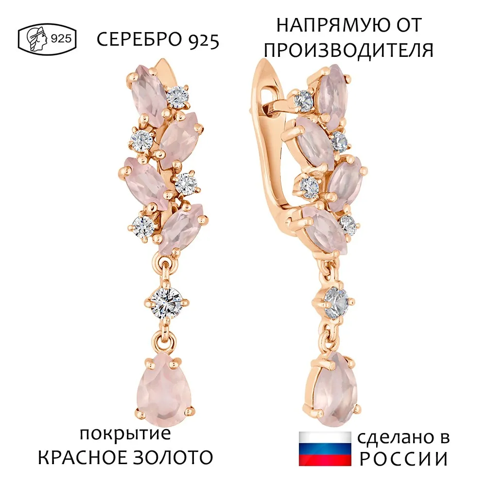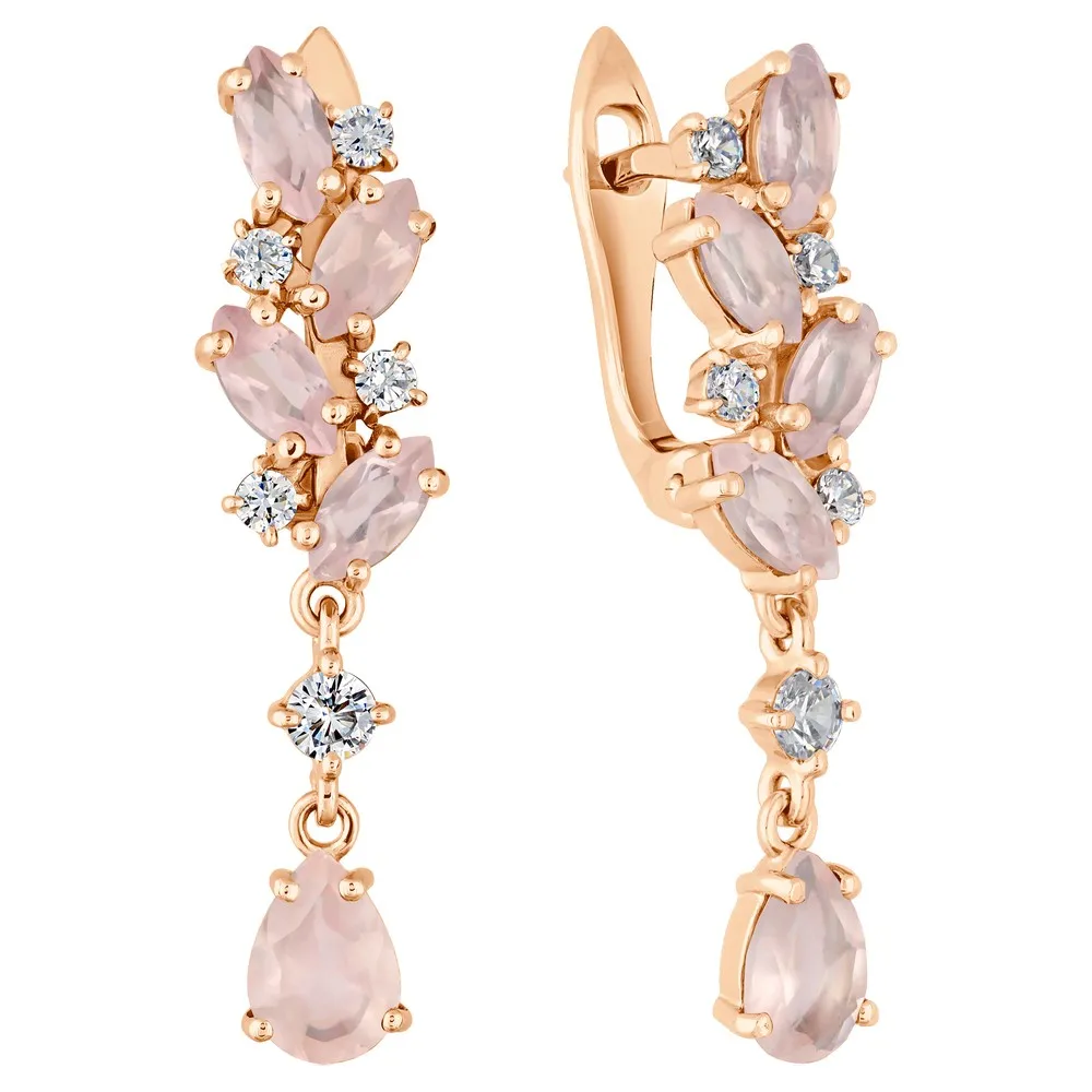 Серебряные серьги с натуральным розовым кварцем - коллекция Росинка / Красное золото.