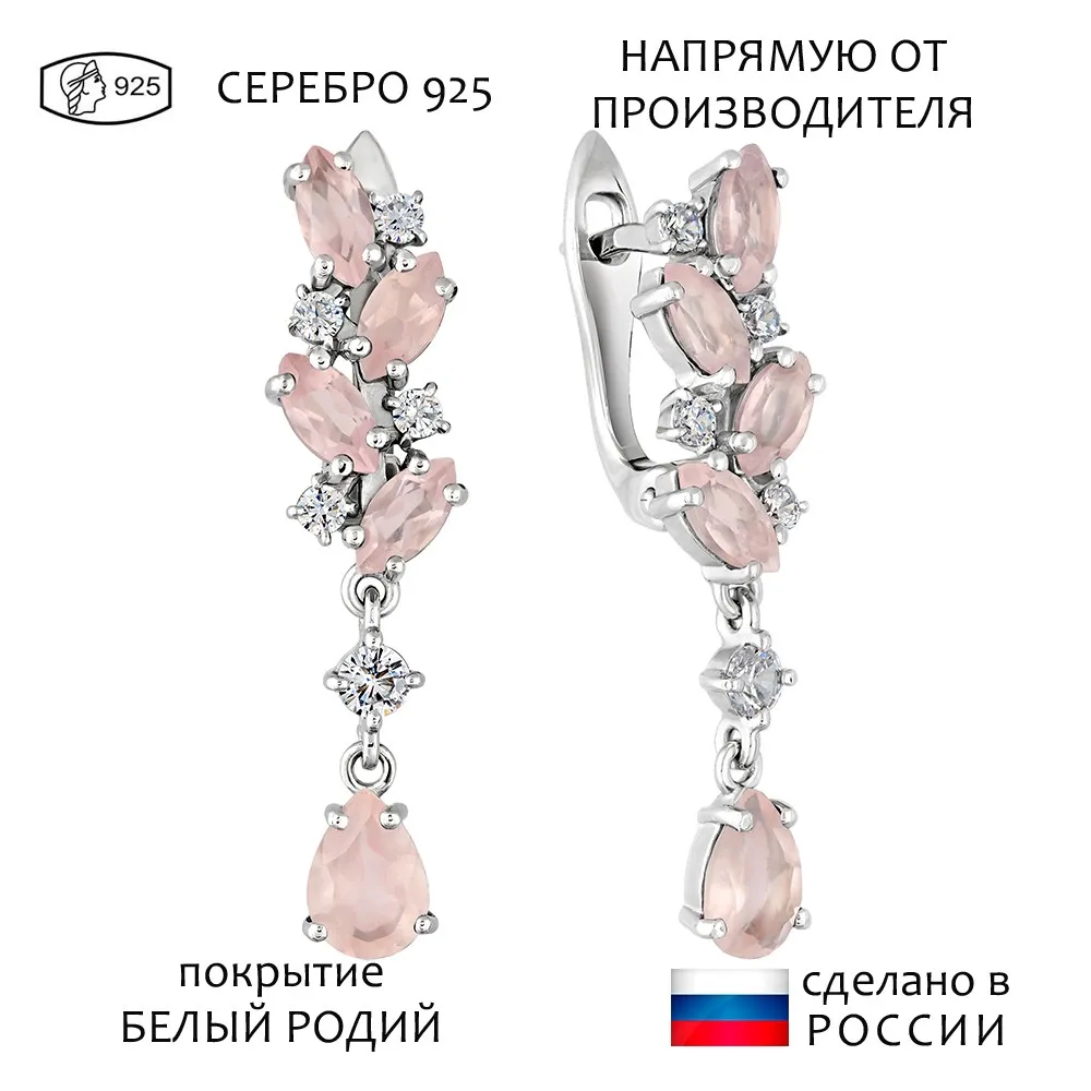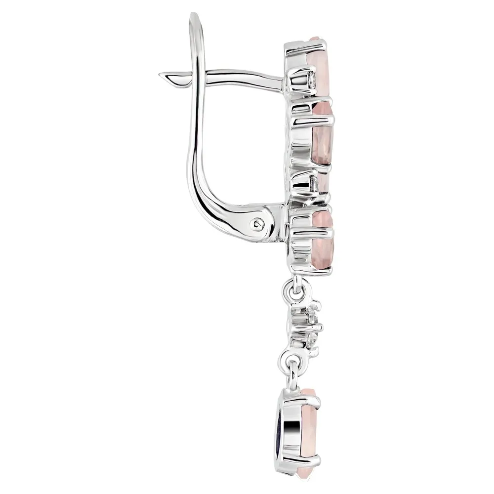 Серебряные серьги с натуральным розовым кварцем - коллекция Росинка / Белый Родий.