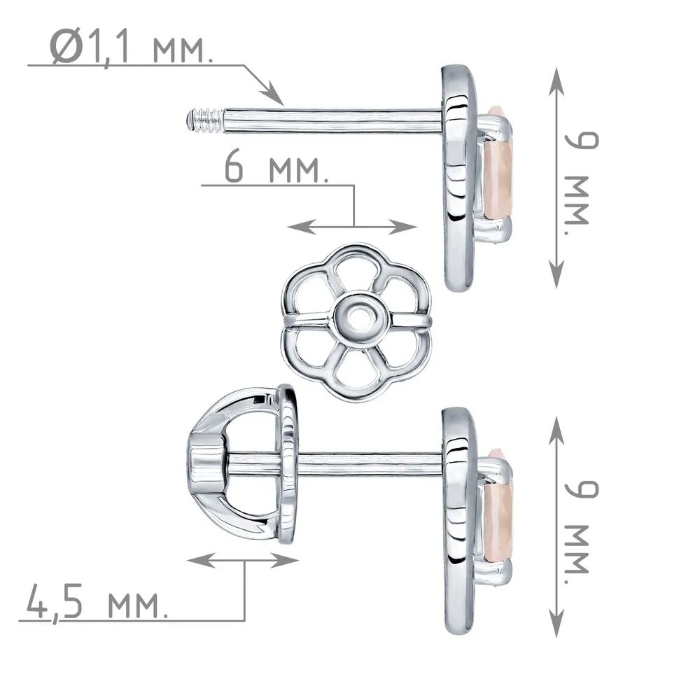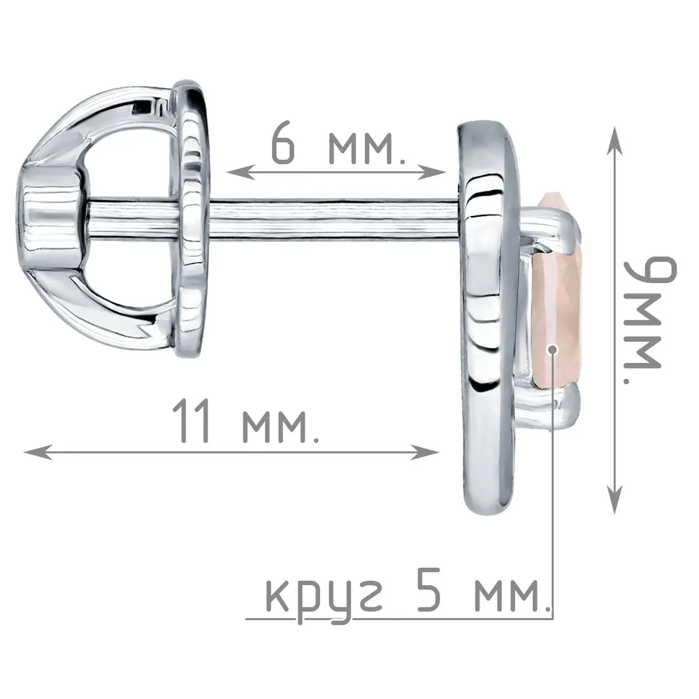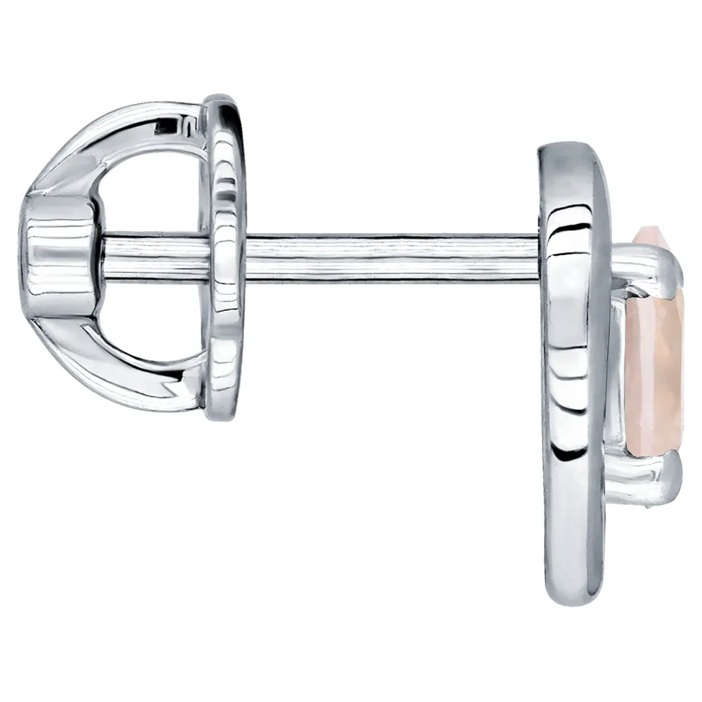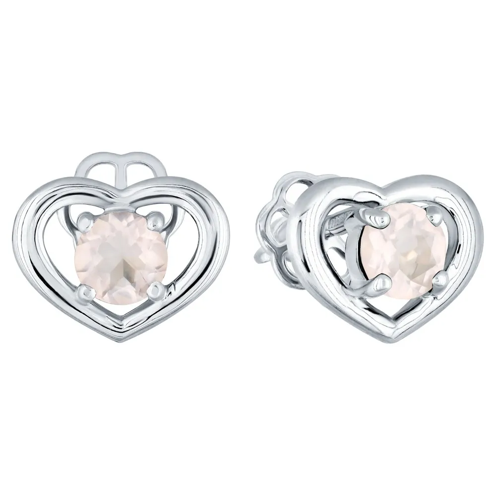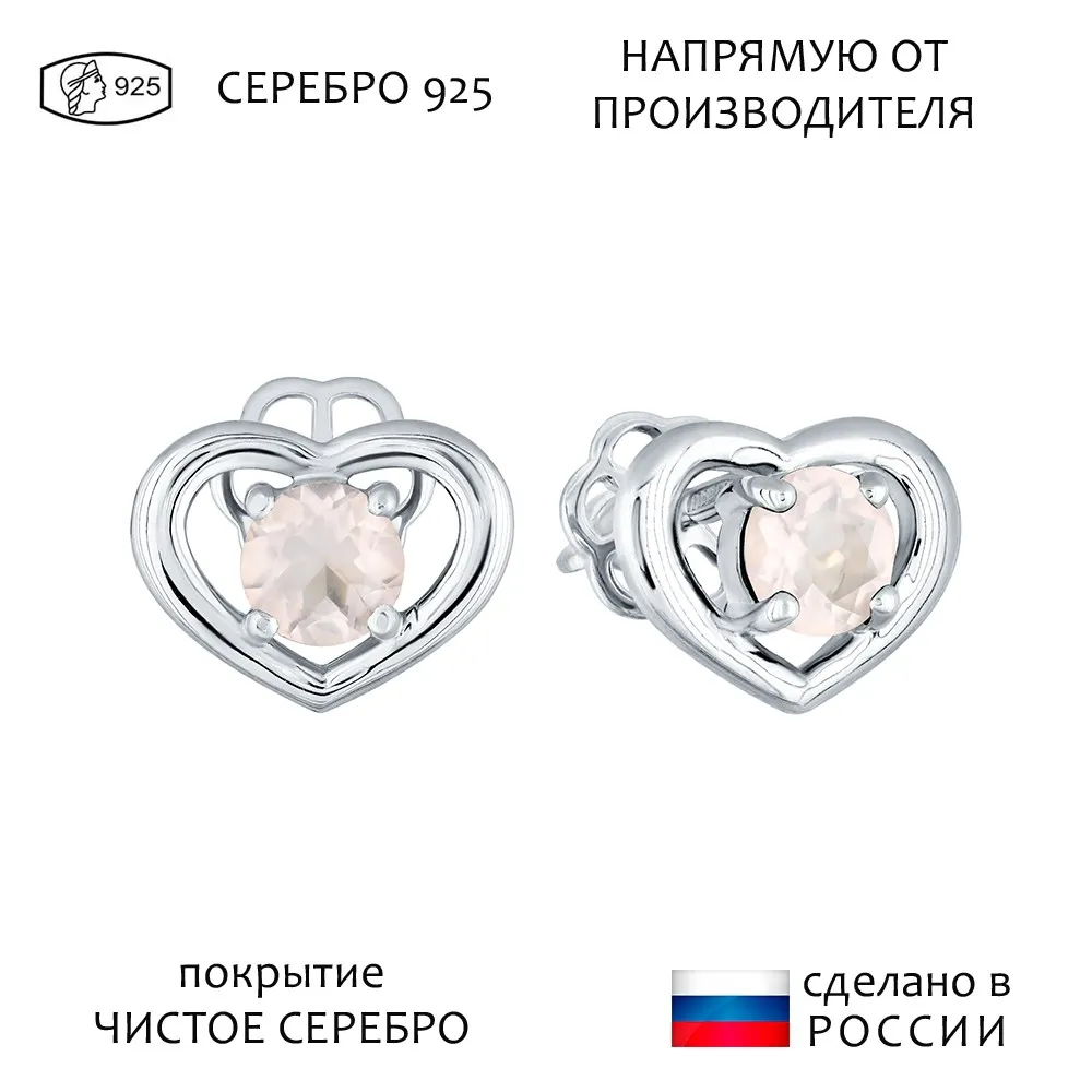 Серебряные серьги гвоздики (пусеты) с натуральным розовым кварцем - Сердце / покрытие Чистое Серебро.