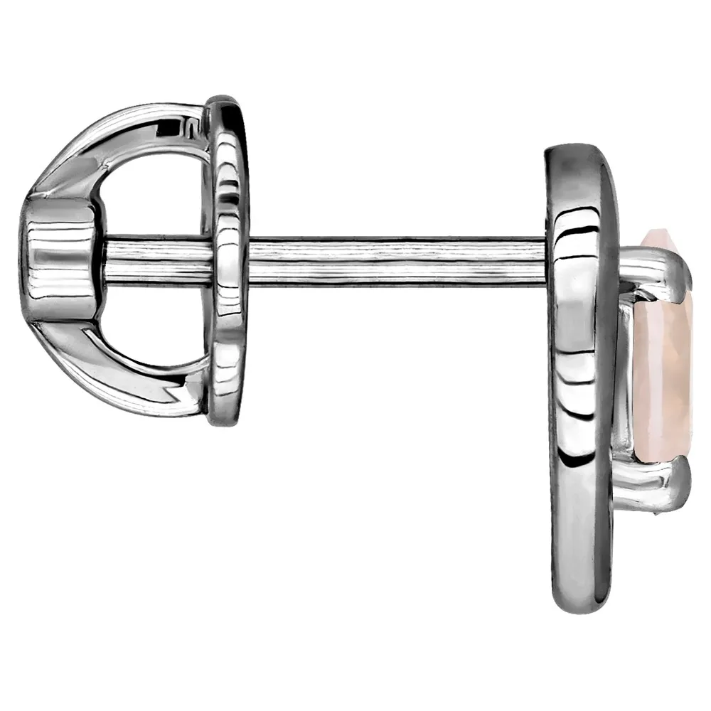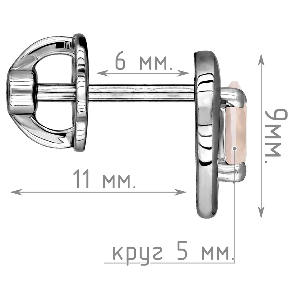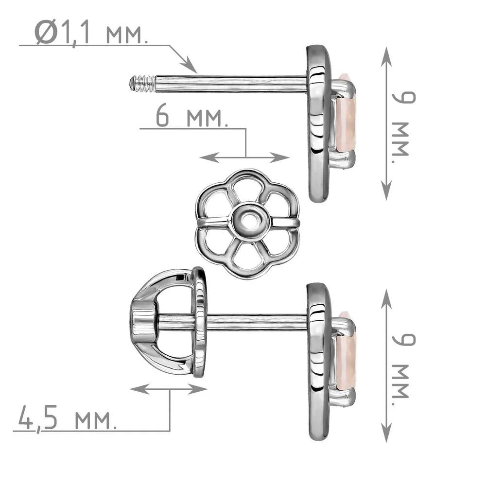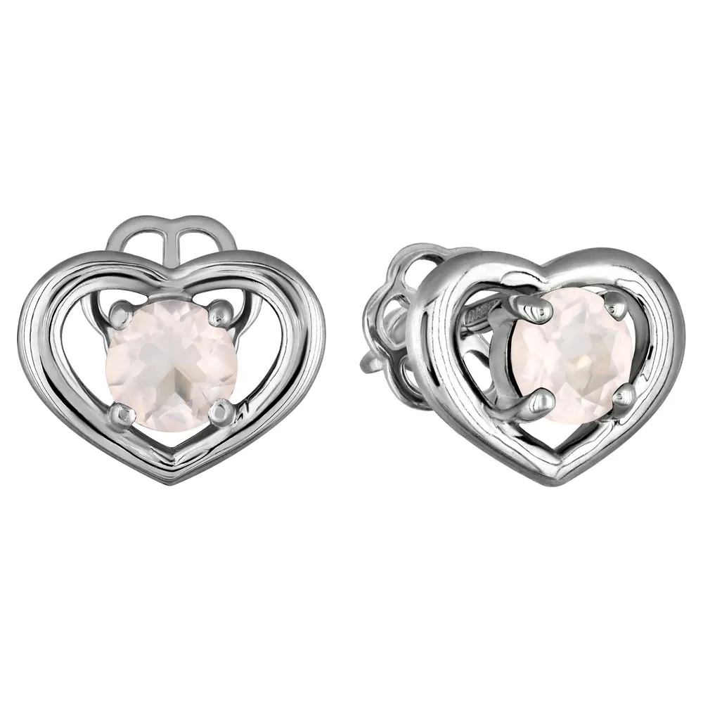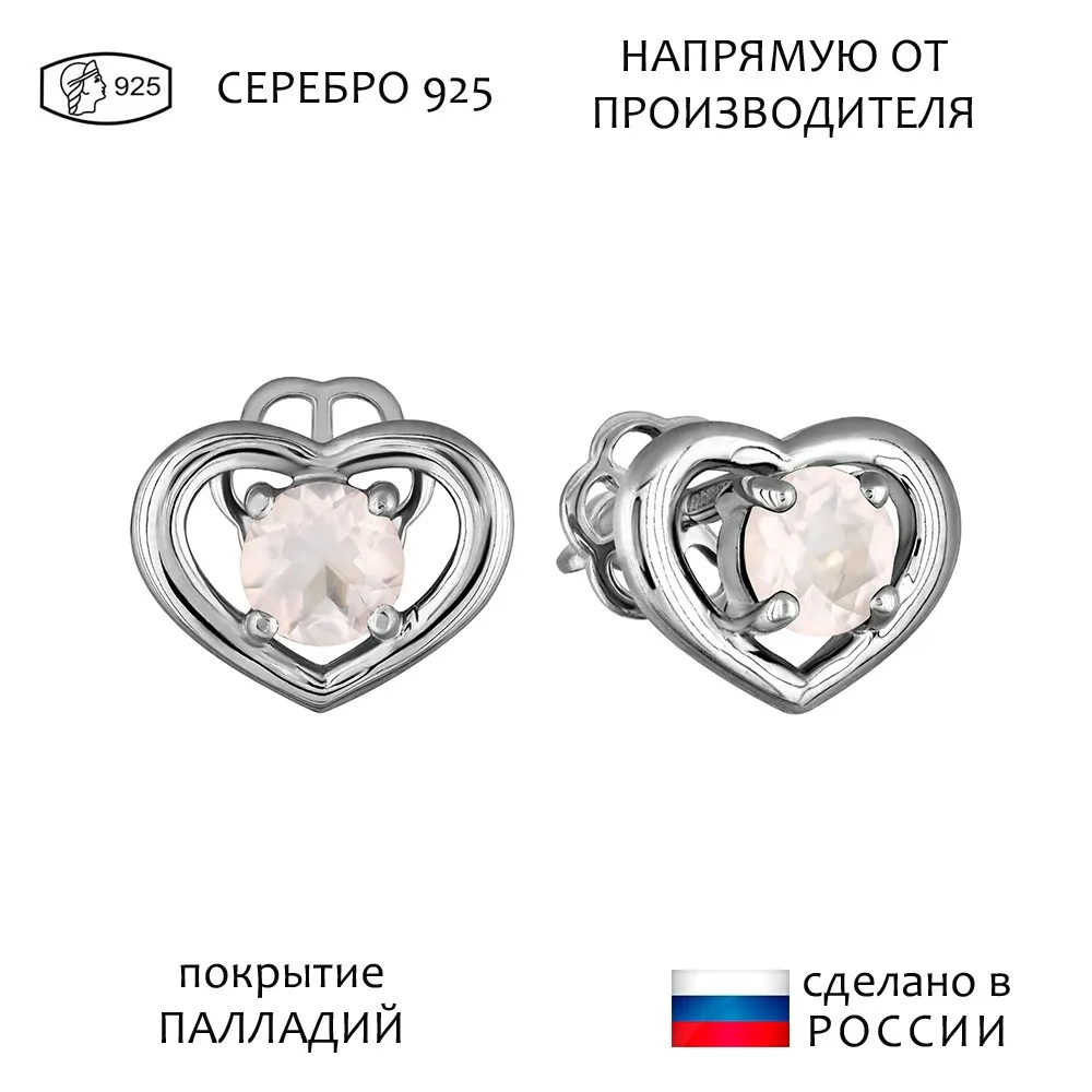 Серебряные серьги гвоздики (пусеты) с натуральным розовым кварцем - Сердце / покрытие Палладий.
