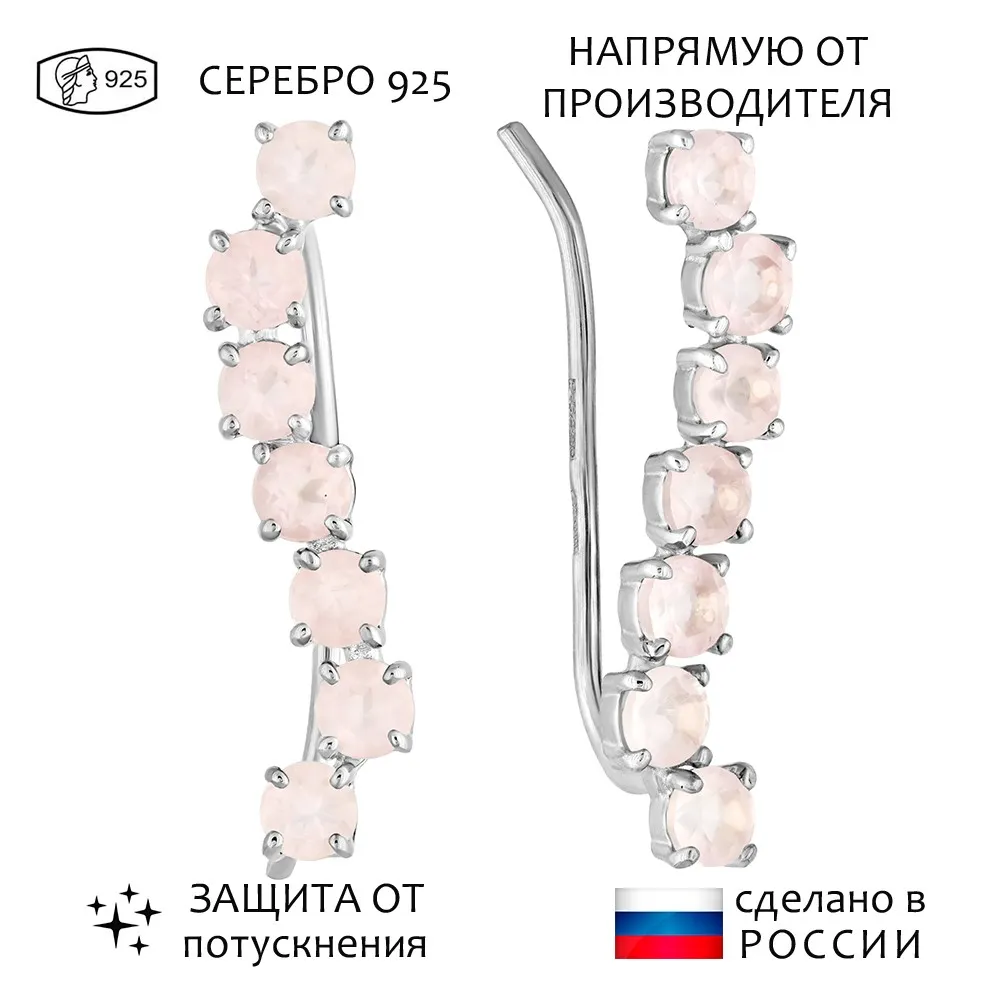 Серебряные серьги каффы с натуральным розовым кварцем - коллекция Волна / Без покрытия.