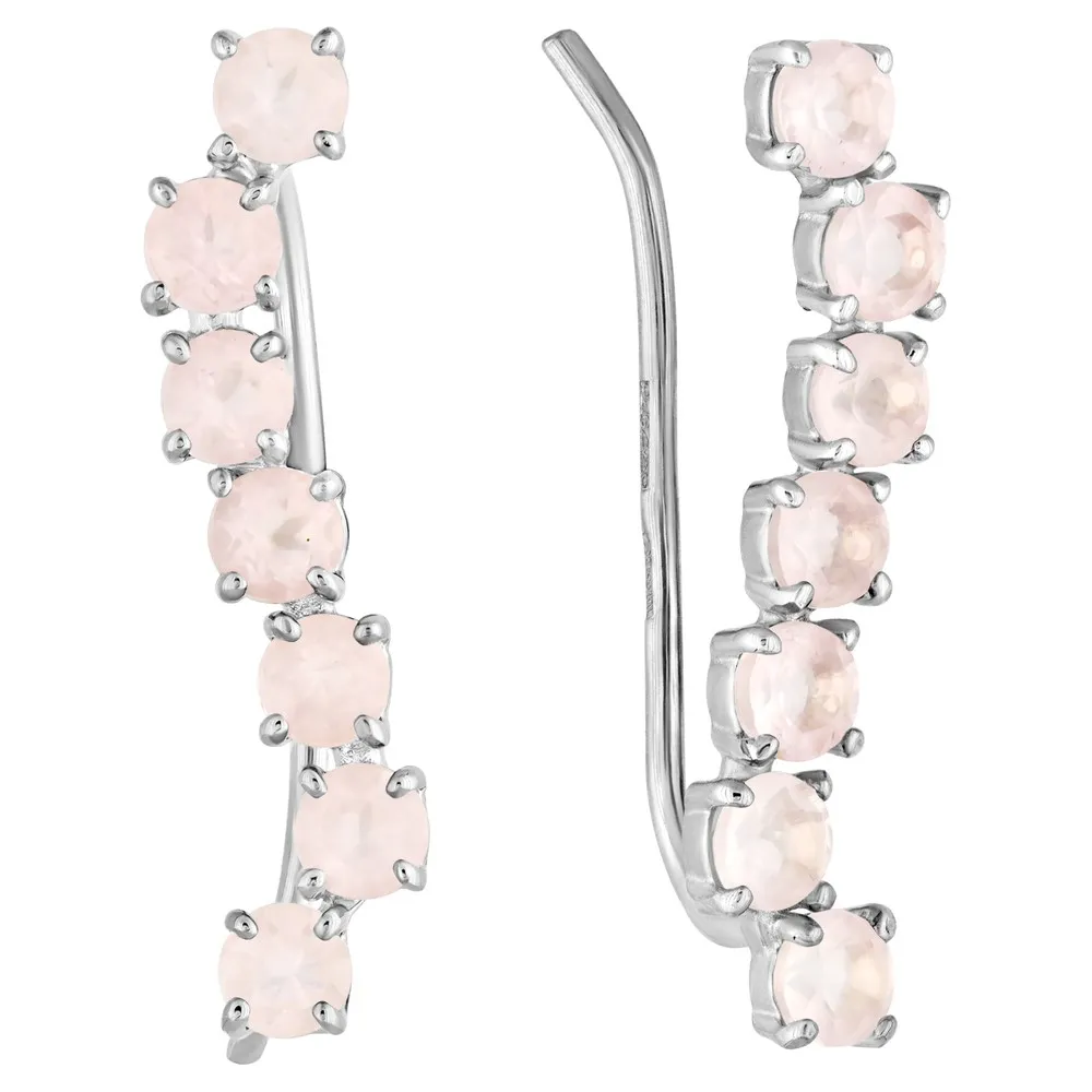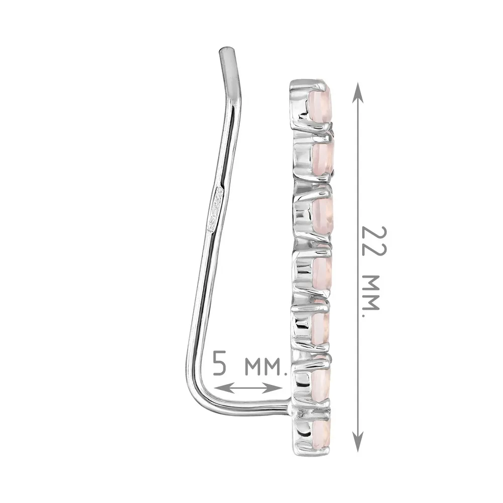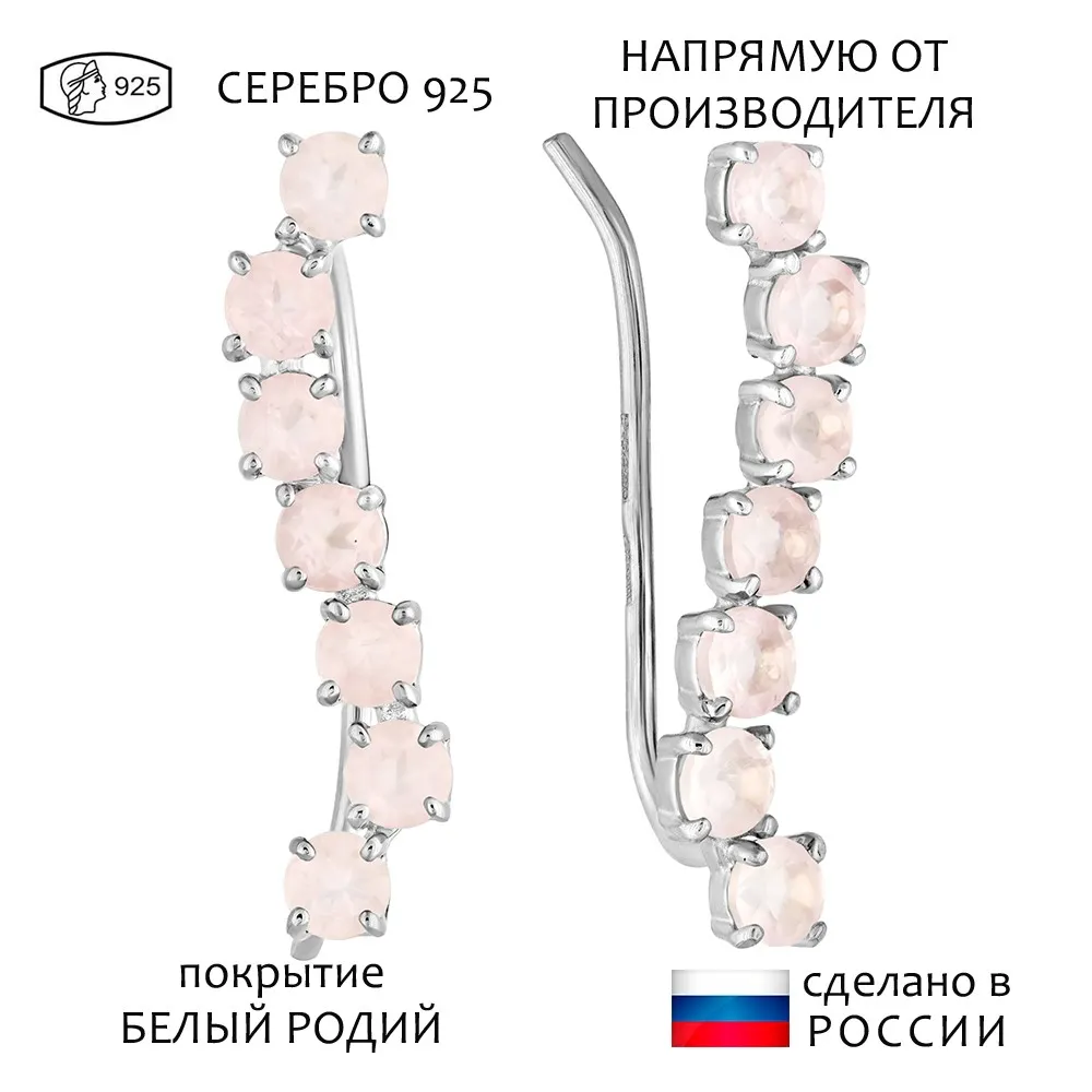 Серебряные серьги каффы с натуральным розовым кварцем - коллекция Волна / Белый Родий.