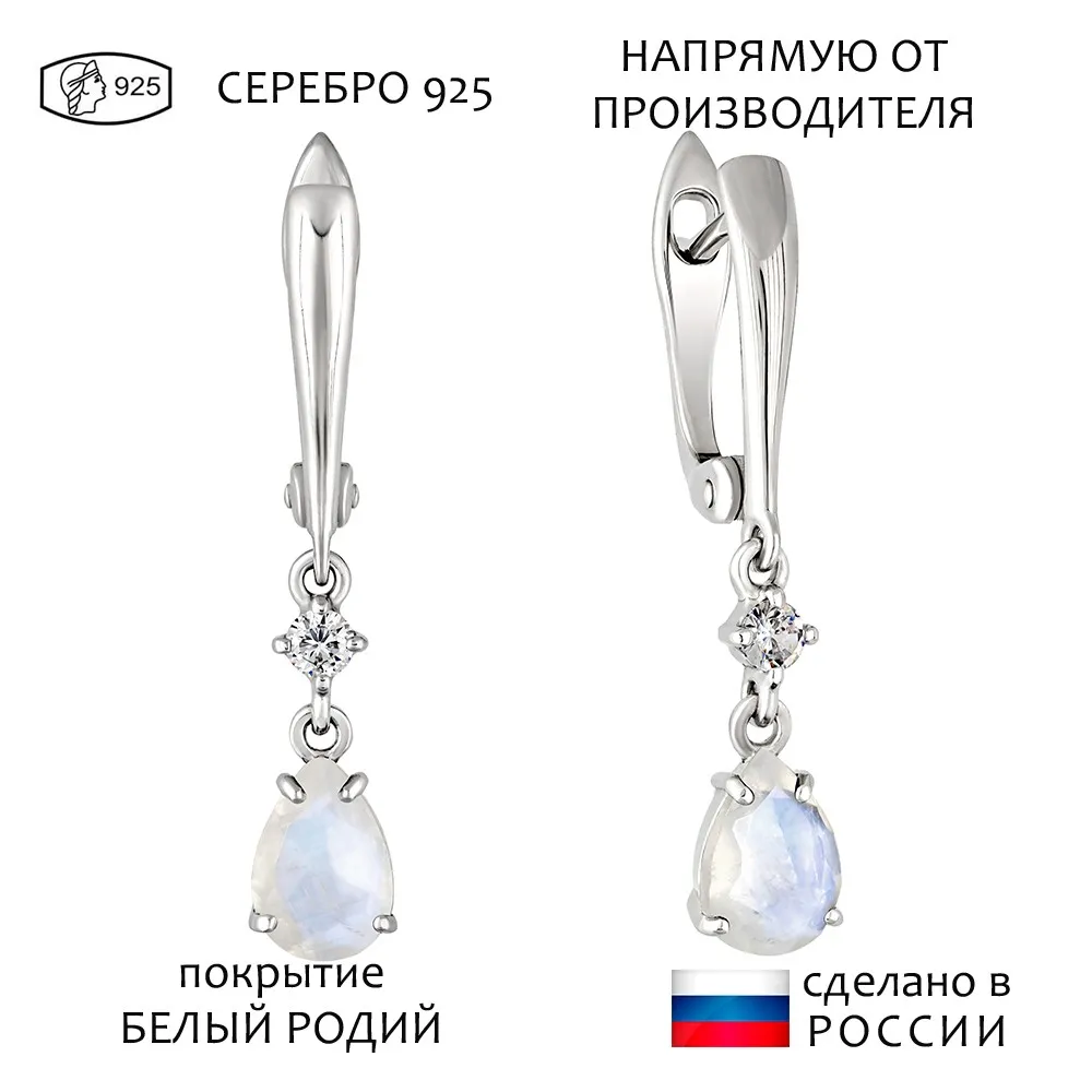 Серебряные серьги с натуральным лунным камнем - коллекция Алсу (большая) / Белый Родий.