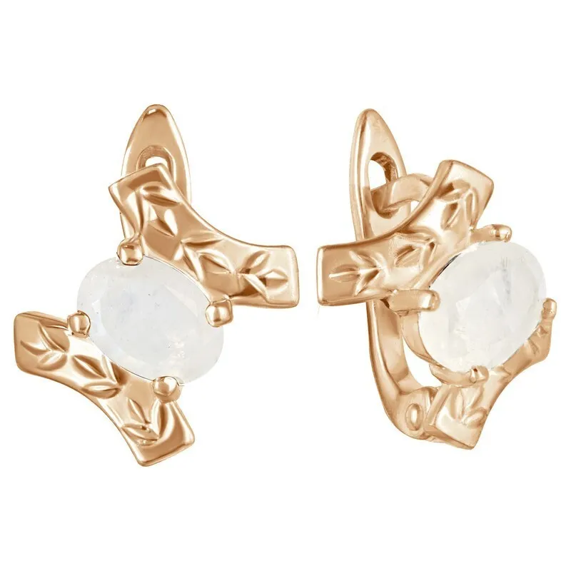 Серебряные серьги с натуральным лунным камнем - коллекция Тея. Серебряные серьги 925 пробы с покрытием розовое золото. Цвет покрытия соответствует швейцарскому цветовому стандарту NIHS -4N и цвету розового золота 585 в России. На последней фотографии мы разместили сравнительную фотографию 3 цвета золотого покрытия. Помимо предания золотого цвета Вашему изделию, тонкий слой золота защищает от окисления. Для более стойкого эффекта золочения и долговечности покрытия мы дополнительно наносим подслой палладия (Pd). Средний вес изделия с камнями 3.56 гр. Месторождение: Лунный камень (Мадагаскар). Лунный камень (Натуральный) овал 5*7 мм., средний вес: 0.75 карат. Все изделия собственного производства. Гарантия 12 месяцев.Арт. 8138. Лунный камень – удивительный по красоте минерал, который всегда считался подарком самой Луны! Он успокаивает владельца и способен избавить его от груза негатива. Особенно подходит женщинам, так как усиливает природное очарование. Считается, что украшения с этим минералом привлекают настоящую любовь.