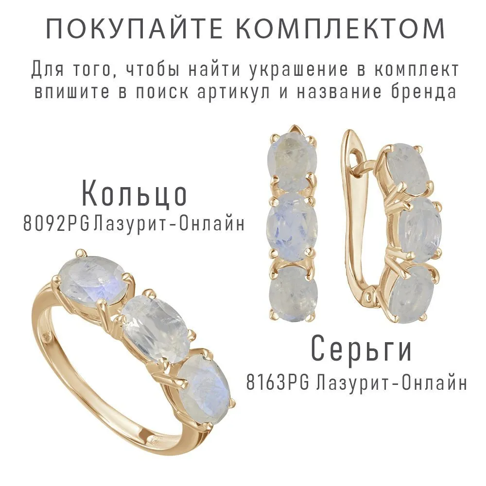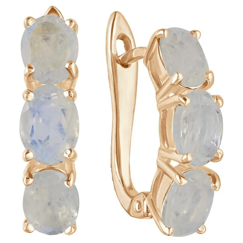 Серебряные серьги с натуральным лунным камнем - коллекция Муза. Серебряные серьги 925 пробы с покрытием розовое золото. Цвет покрытия соответствует швейцарскому цветовому стандарту NIHS -4N и цвету розового золота 585 в России. На последней фотографии мы разместили сравнительную фотографию 3 цвета золотого покрытия. Помимо предания золотого цвета Вашему изделию, тонкий слой золота защищает от окисления. Для более стойкого эффекта золочения и долговечности покрытия мы дополнительно наносим подслой палладия (Pd). Средний вес изделия с камнями 4.06 гр. Месторождение: Лунный камень (Мадагаскар). Лунный камень (Натуральный) овал 5*7 мм., средний вес: 0.75 карат. Все изделия собственного производства. Гарантия 12 месяцев.Арт. 8163. Лунный камень – удивительный по красоте минерал, который всегда считался подарком самой Луны! Он успокаивает владельца и способен избавить его от груза негатива. Особенно подходит женщинам, так как усиливает природное очарование. Считается, что украшения с этим минералом привлекают настоящую любовь.