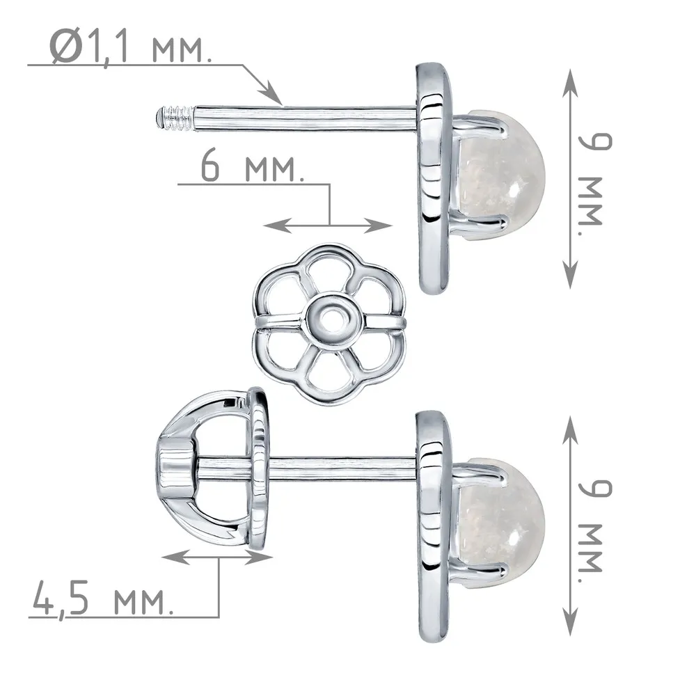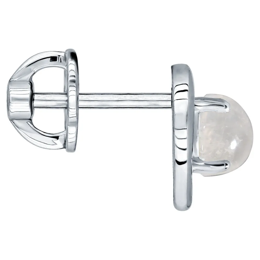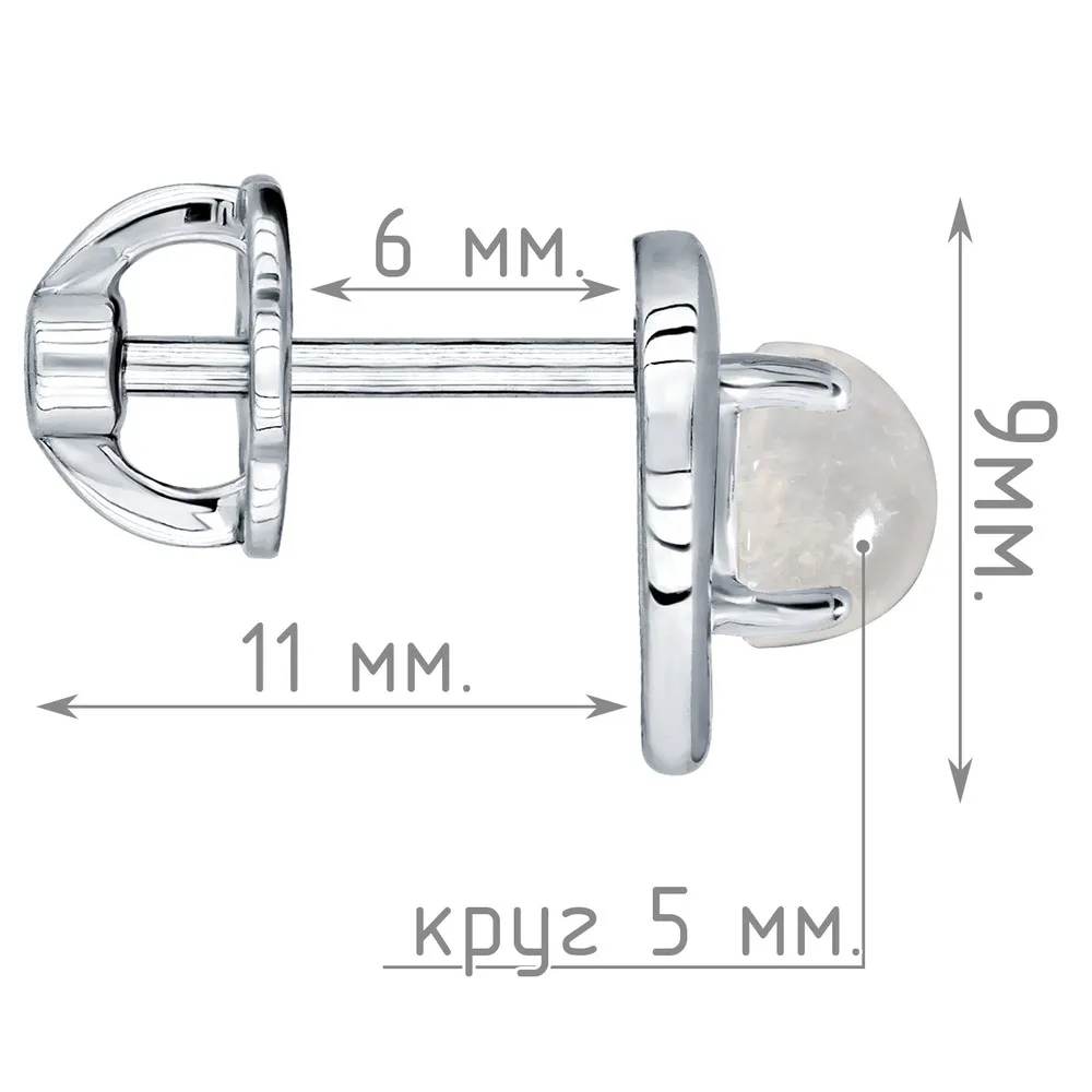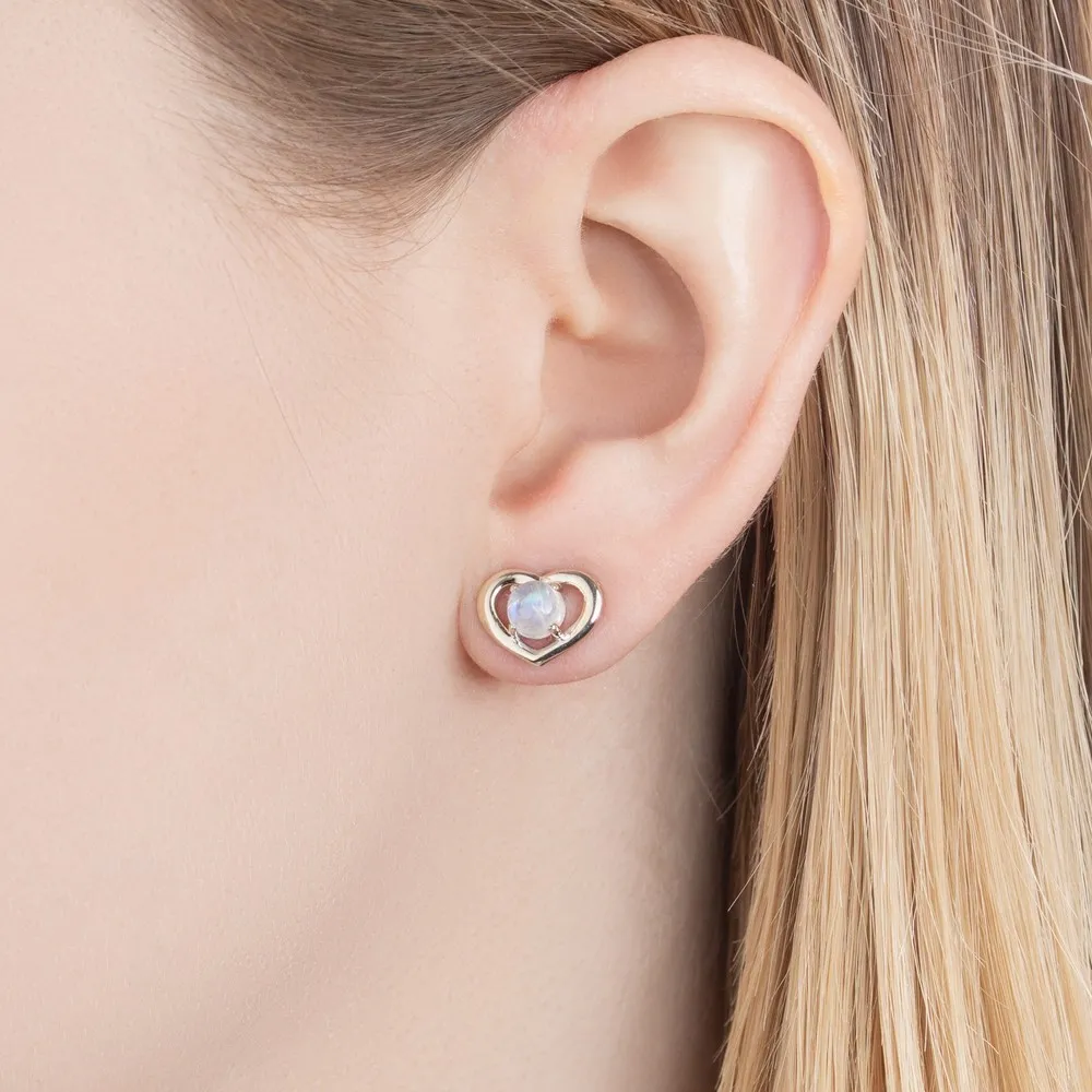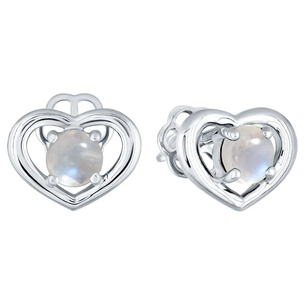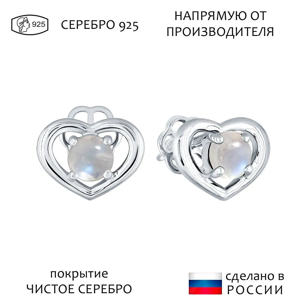 Серебряные серьги гвоздики (пусеты) с натуральным лунным камнем (каб.) - Сердце / покрытие Чистое Серебро.
