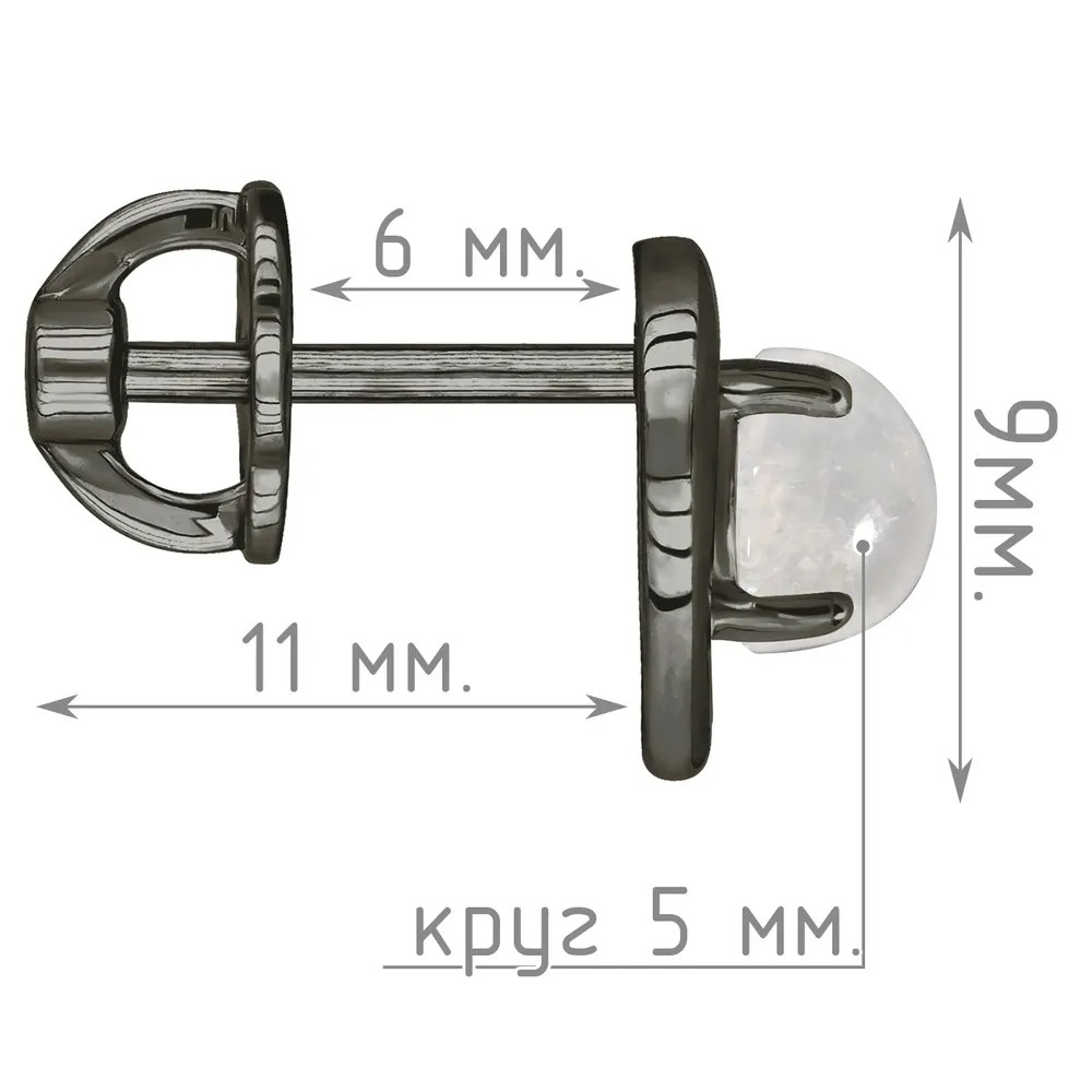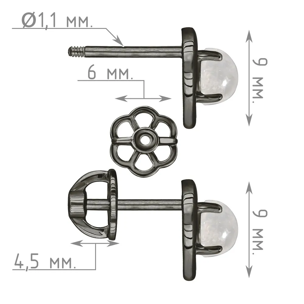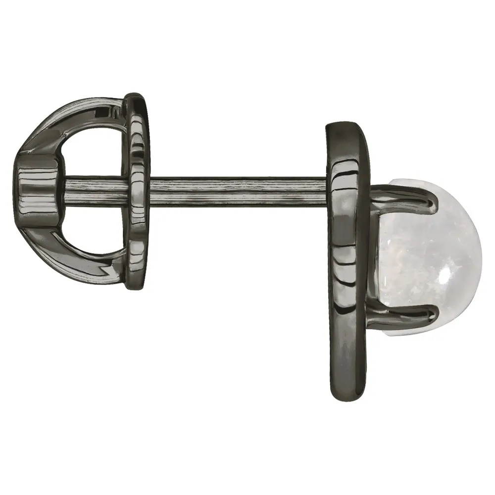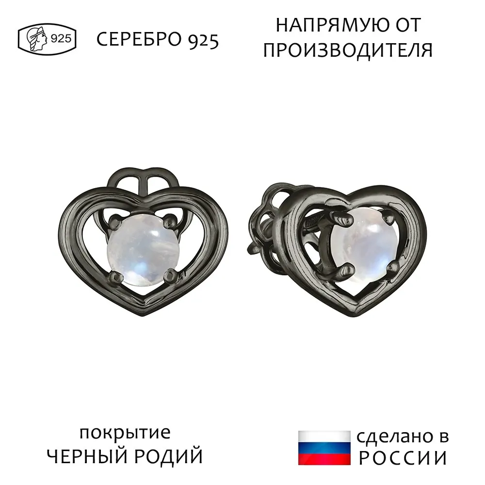 Серебряные серьги гвоздики (пусеты) с натуральным лунным камнем (каб.) - Сердце / покрытие Черный Родий.
