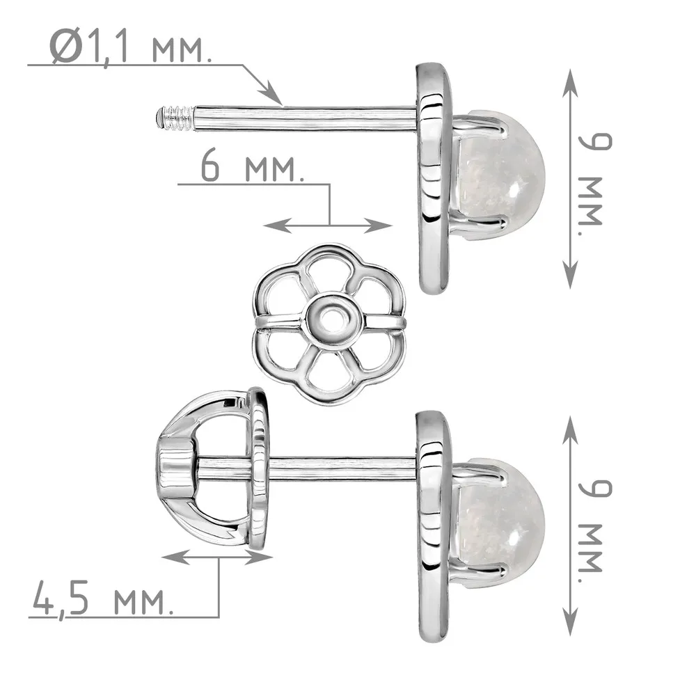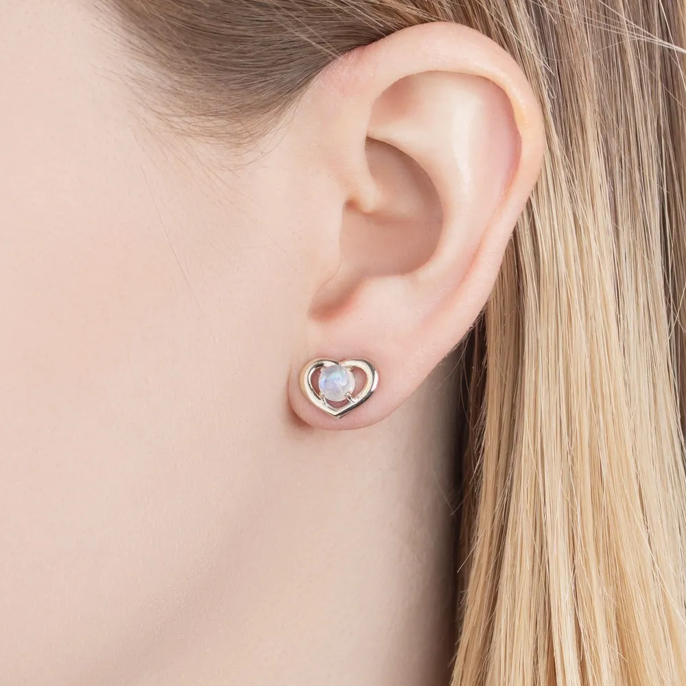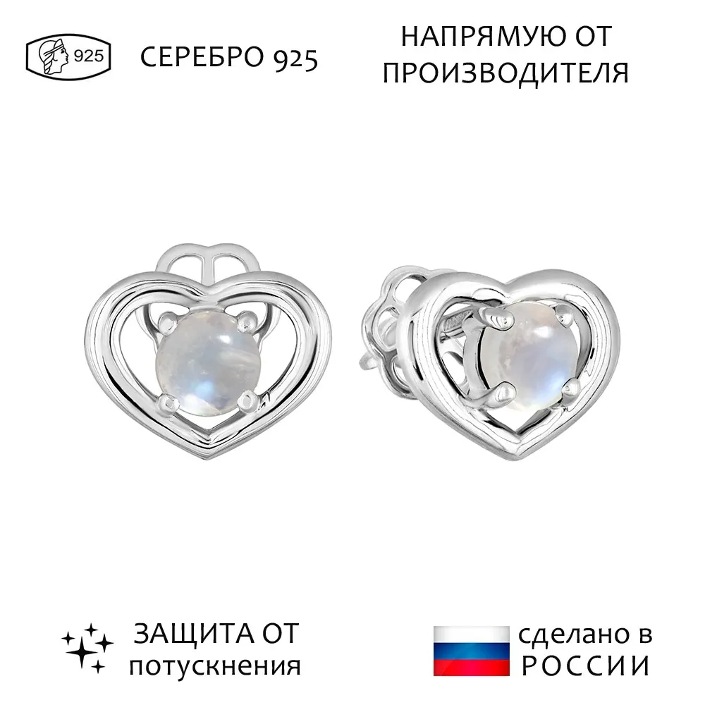 Серебряные серьги гвоздики (пусеты) с натуральным лунным камнем (каб.) - Сердце / Без покрытия.
