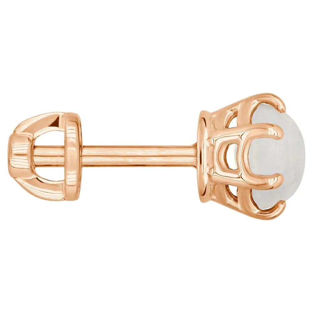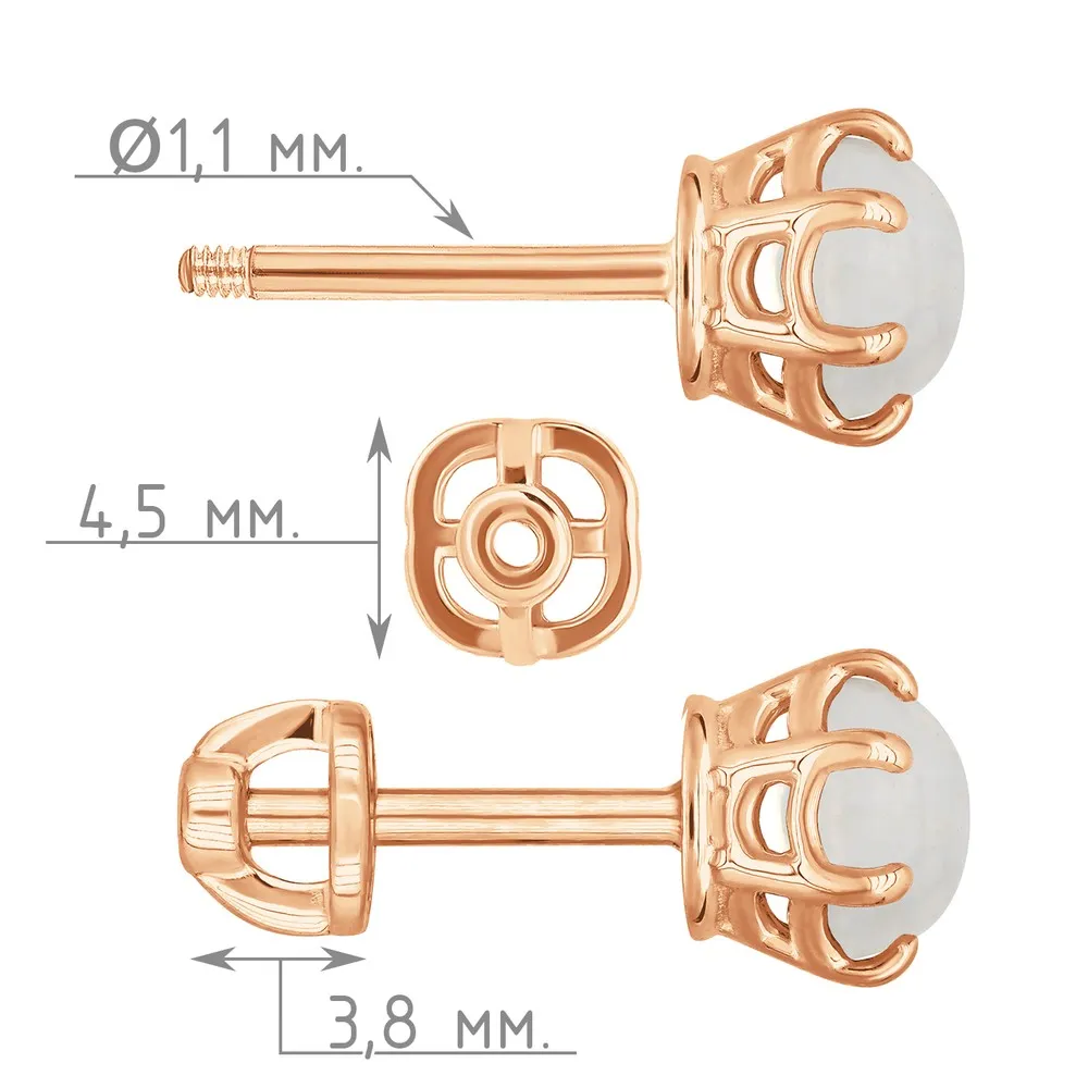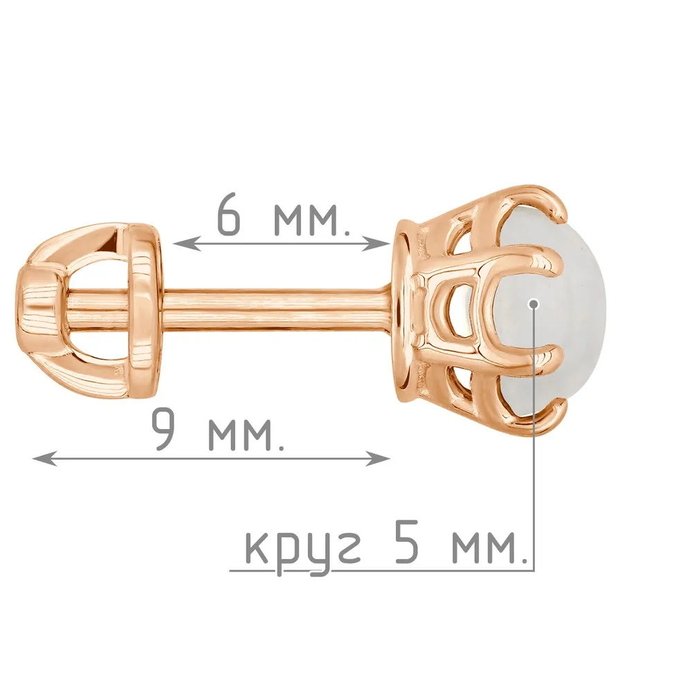 Серебряные серьги гвоздики (пусеты) с натуральным лунным камнем (каб.) 5 мм. / Красное золото.