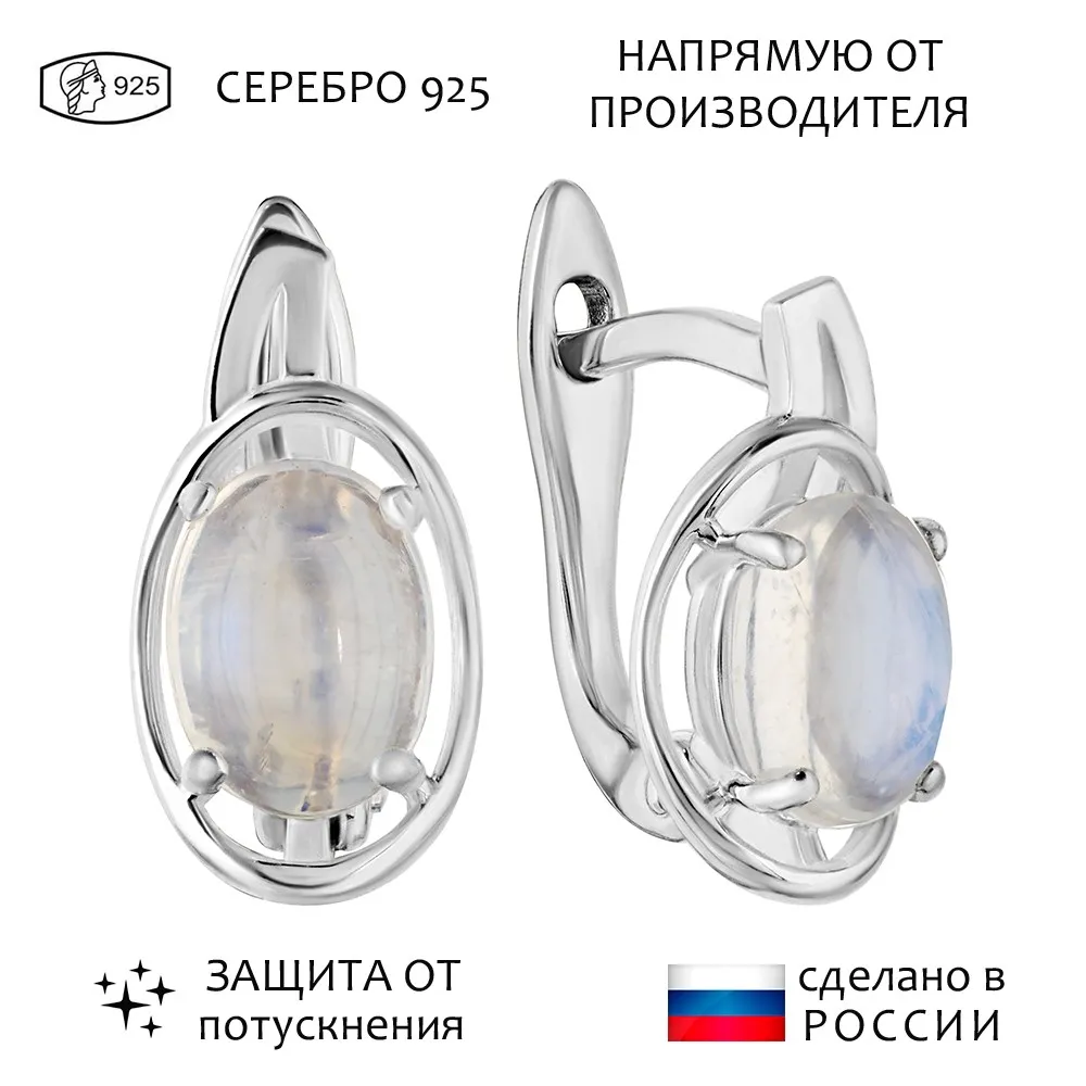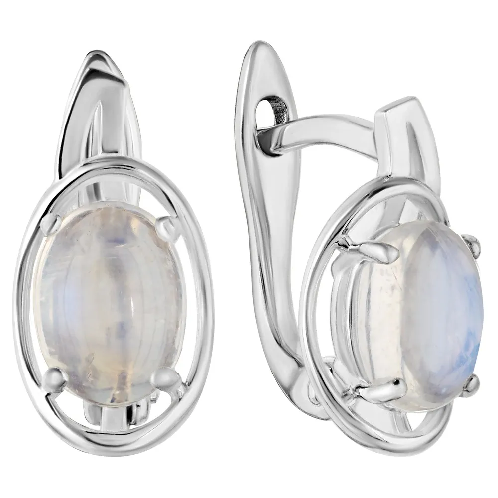 Серебряные серьги с натуральным лунным камнем (каб.) - коллекция Фрейя / Без покрытия.