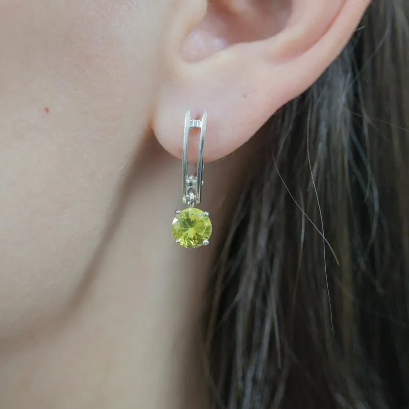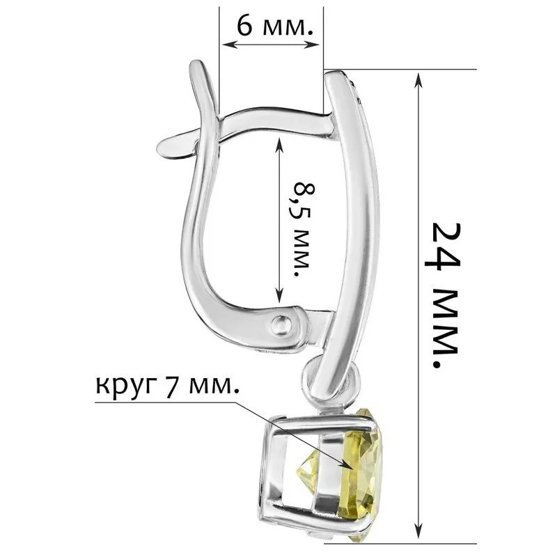 Серебряные серьги с нанокристаллом, цвет желтый - коллекция Классик (мини). Средний вес изделия с камнями 3.87 гр. Размер главного камня: круг 7 мм. Нанокристалл - синтезированный ювелирный нанокристалл, превосходящий по блеску, преломлению света, твердости, плотности простой фианит. Все изделия собственного производства. Арт. 8247.