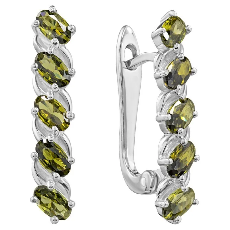 Серебряные серьги с нанокристаллом, цвет оливковый - коллекция Колосок. Средний вес изделия с камнями 4.09 гр. Размер главного камня: овал 3*5 мм. Нанокристалл - синтезированный ювелирный нанокристалл, превосходящий по блеску, преломлению света, твердости, плотности простой фианит. Все изделия собственного производства. Арт. 8293.