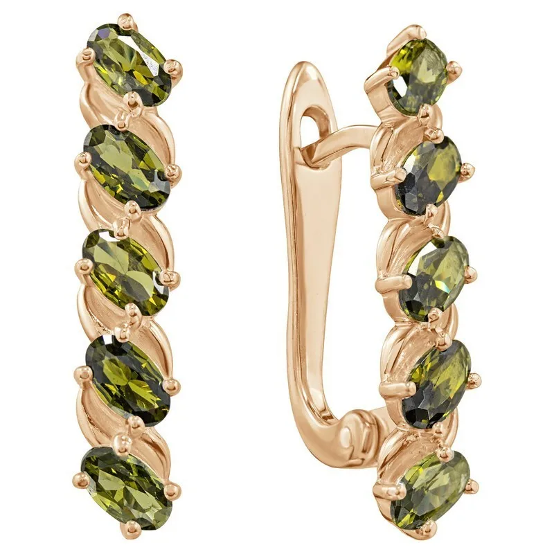 Серебряные серьги с нанокристаллом, цвет оливковый - коллекция Колосок. Серебряные серьги 925 пробы с покрытием розовое золото. Цвет покрытия соответствует швейцарскому цветовому стандарту NIHS -4N и цвету розового золота 585 в России. На последней фотографии мы разместили сравнительную фотографию 3 цвета золотого покрытия. Помимо предания золотого цвета Вашему изделию, тонкий слой золота защищает от окисления. Для более стойкого эффекта золочения и долговечности покрытия мы дополнительно наносим подслой палладия (Pd). Средний вес изделия с камнями 4.09 гр. Размер главного камня: овал 3*5 мм. Нанокристалл - синтезированный ювелирный нанокристалл, превосходящий по блеску, преломлению света, твердости, плотности простой фианит. Все изделия собственного производства. Арт. 8293.