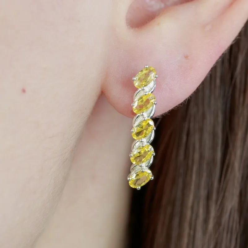 Серебряные серьги с нанокристаллом, цвет желтый - коллекция Колосок. Средний вес изделия с камнями 4.09 гр. Размер главного камня: овал 3*5 мм. Нанокристалл - синтезированный ювелирный нанокристалл, превосходящий по блеску, преломлению света, твердости, плотности простой фианит. Все изделия собственного производства. Арт. 8295.