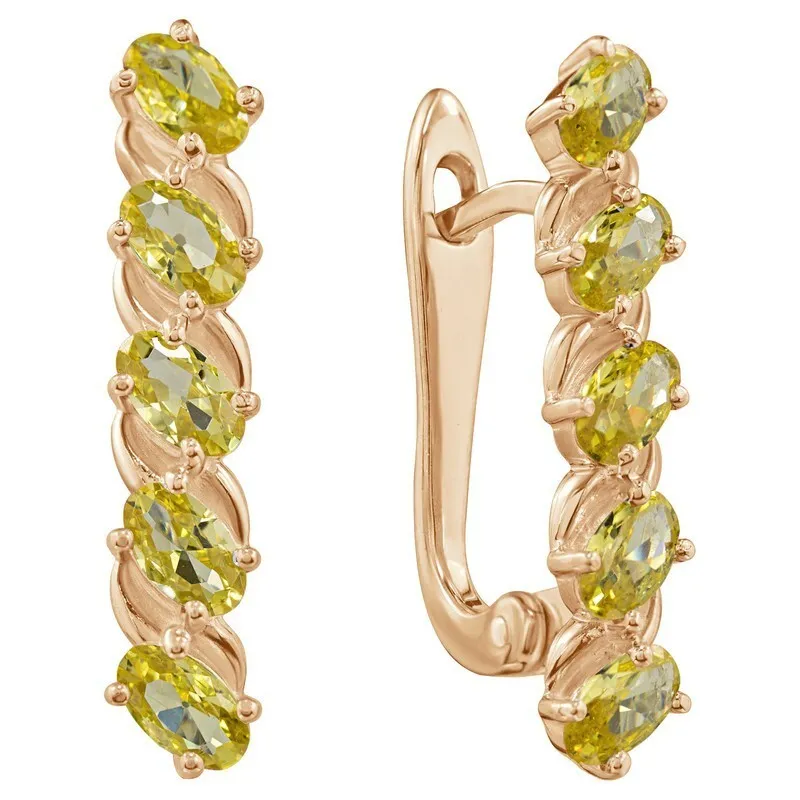 Серебряные серьги с нанокристаллом, цвет желтый - коллекция Колосок. Серебряные серьги 925 пробы с покрытием розовое золото. Цвет покрытия соответствует швейцарскому цветовому стандарту NIHS -4N и цвету розового золота 585 в России. На последней фотографии мы разместили сравнительную фотографию 3 цвета золотого покрытия. Помимо предания золотого цвета Вашему изделию, тонкий слой золота защищает от окисления. Для более стойкого эффекта золочения и долговечности покрытия мы дополнительно наносим подслой палладия (Pd). Средний вес изделия с камнями 4.09 гр. Размер главного камня: овал 3*5 мм. Нанокристалл - синтезированный ювелирный нанокристалл, превосходящий по блеску, преломлению света, твердости, плотности простой фианит. Все изделия собственного производства. Арт. 8295.