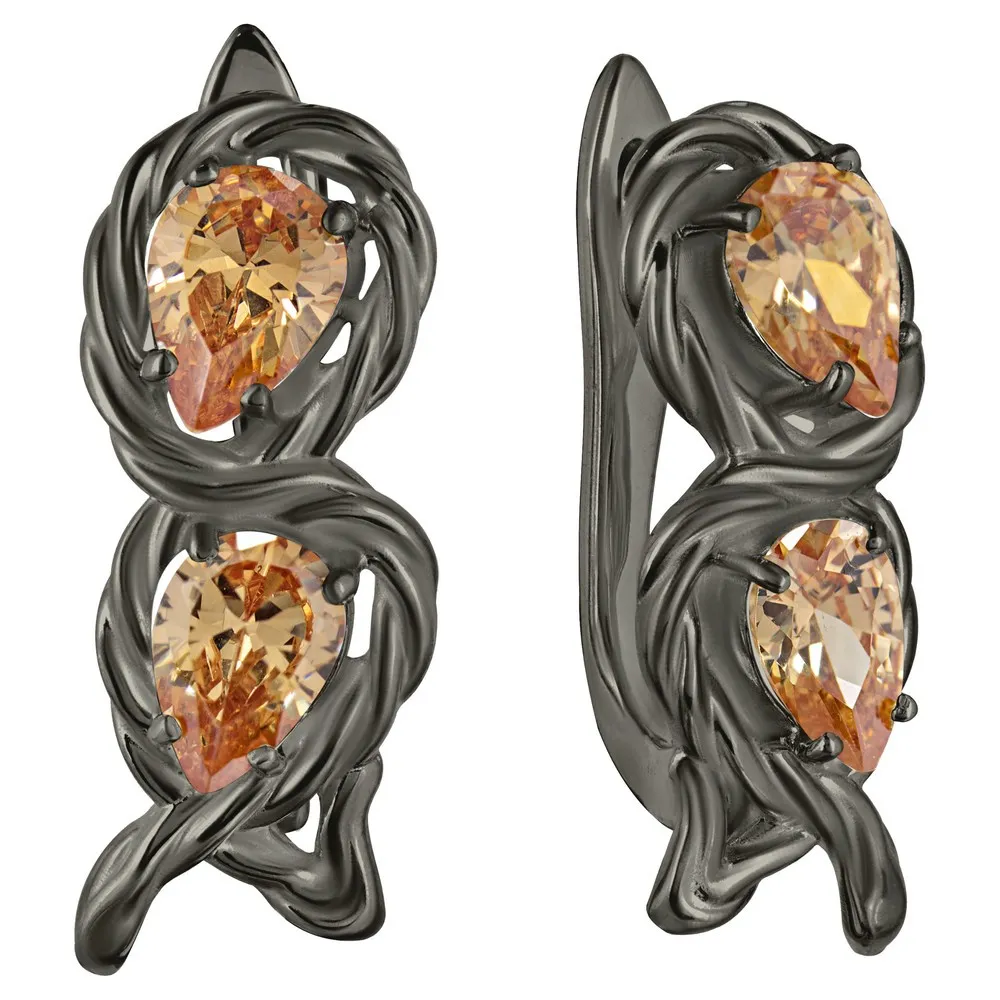 Серебряные серьги с нанокристаллом, цвет персиковый - коллекция Ривьера, покрытие Черный Родий.
