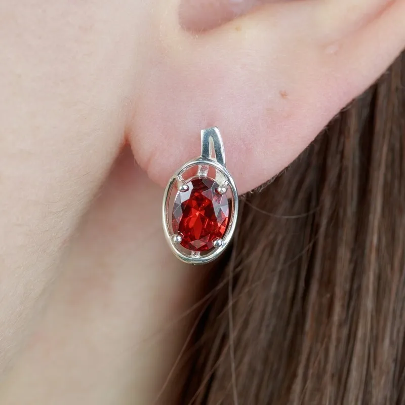 Серебряные серьги с нанокристаллом, цвет красный - коллекция Фрейя. Средний вес изделия с камнями 3.57 гр. Размер главного камня: овал 6*8 мм. Нанокристалл - синтезированный ювелирный нанокристалл, превосходящий по блеску, преломлению света, твердости, плотности простой фианит. Все изделия собственного производства. Арт. 8317.