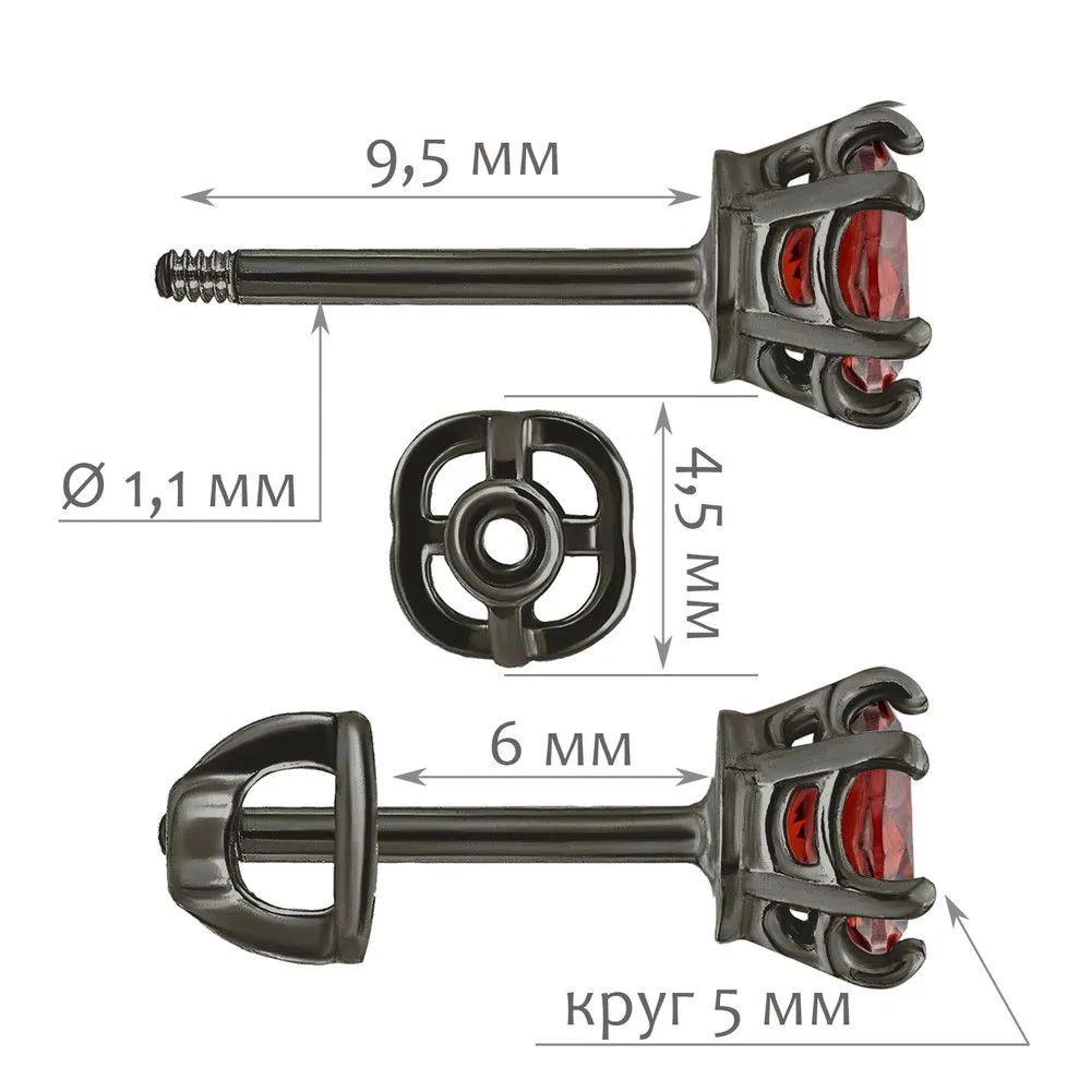 Серебряные серьги гвоздики (пусеты) с красным нанокристаллом 5 мм. / Черный Родий. Средний вес ювелирного украшения с камнями 1.37 гр. Размер главного камня: круг 5 мм. Нанокристалл - синтезированный ювелирный нанокристалл, превосходящий по блеску, преломлению света, твердости, плотности простой фианит. Все изделия собственного производства и имеют гарантию 12 месяцев. Арт. 8583BR.