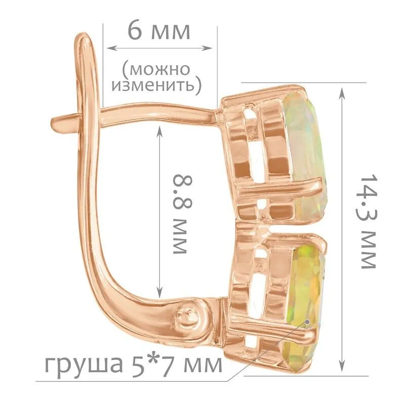 Серебряные серьги с натуральным опалом (1 класс) - коллекция Дуэт / покрытие Красное Золото.Средний вес украшения с камнями 2.88 гр.Месторождение(я): Опал (Эфиопия).Ювелирные вставки:Опал (Натуральный) груша 5*7 мм., средний вес: 0.38 карат.Все изделия собственного производства и имеют гарантию 12 месяцев. Арт. 8688RG . Опал – это благородный камень, известный ещё с древности. Ему приписывали разнообразные магические свойства. Окраска опала многовариантна, выделяют более ста типов. Он помогал справиться с порчей и сглазом, защищал от негативной энергетики, способствовал излечению мигреней. Как талисман для ребенка, становился защитником от дурных сил и заболеваний.