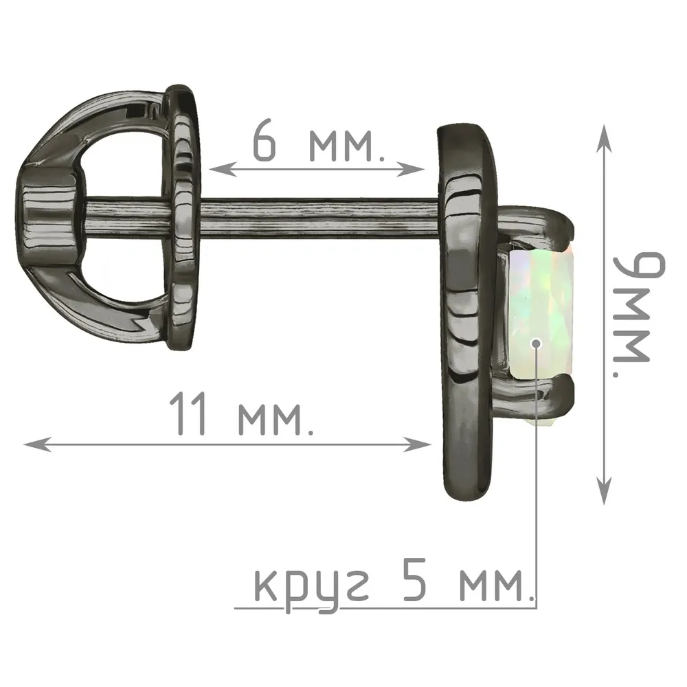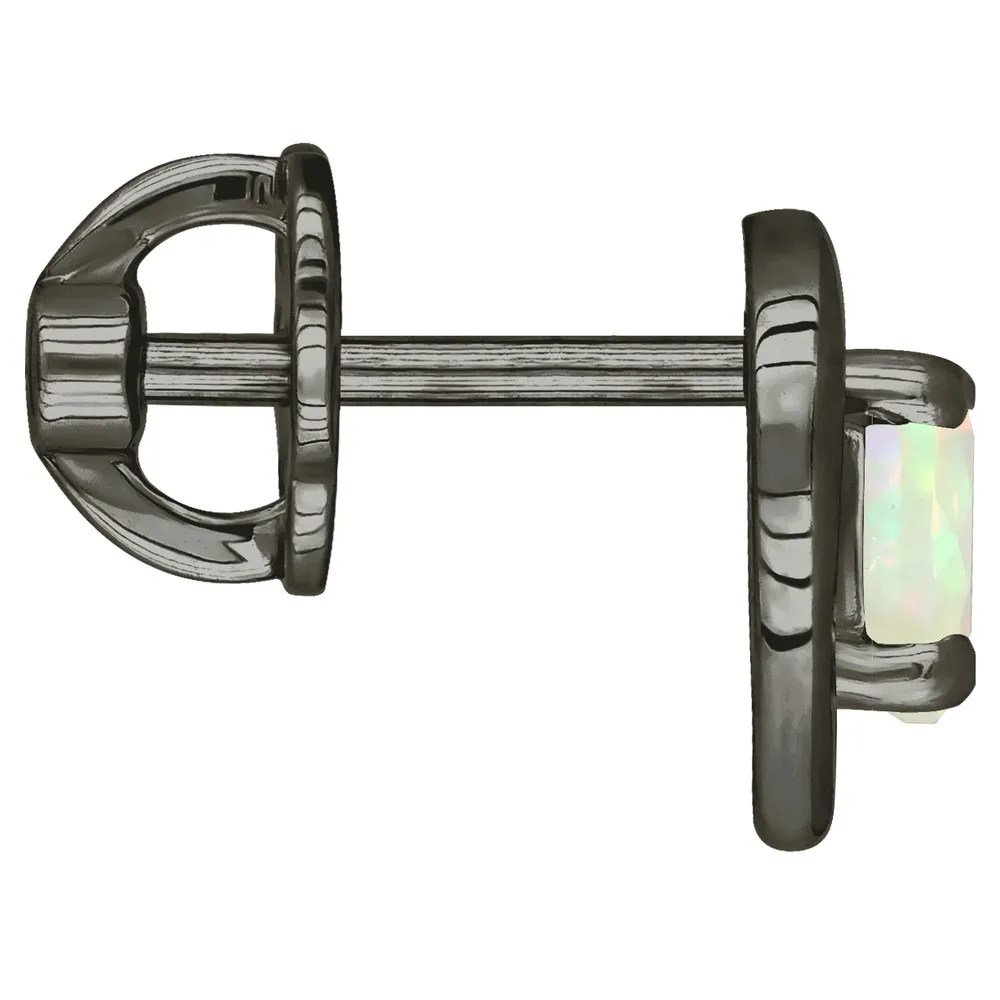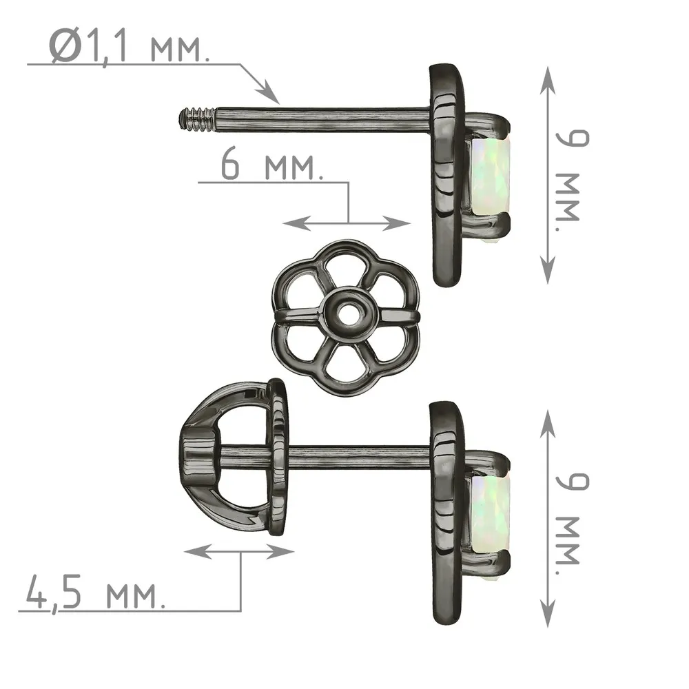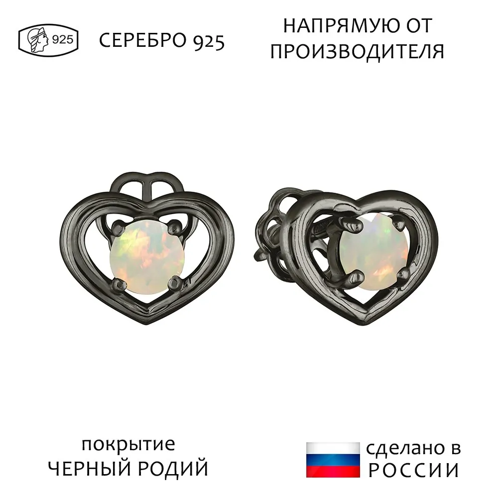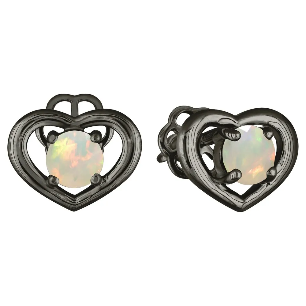 Серебряные серьги гвоздики (пусеты) с натуральным опалом (1 класс) - Сердце / покрытие Черный Родий.