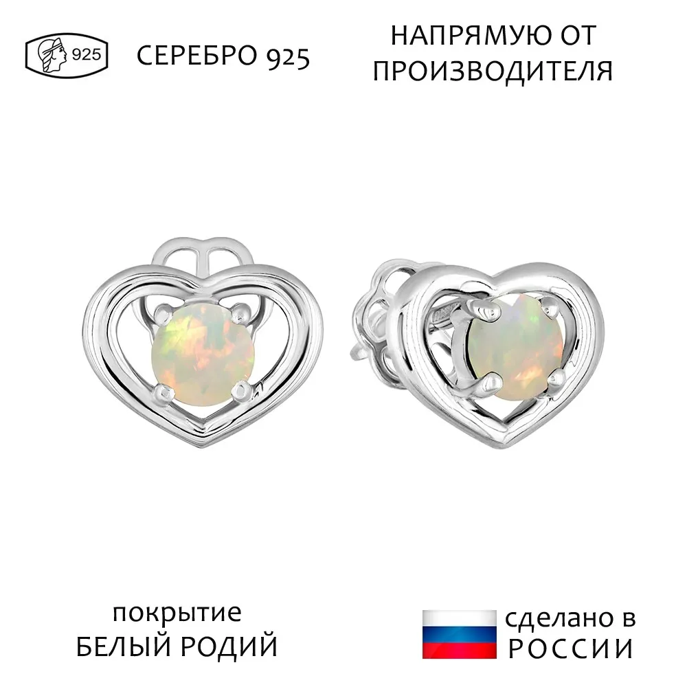 Серебряные серьги гвоздики (пусеты) с натуральным опалом (1 класс) - Сердце / покрытие Белый Родий.