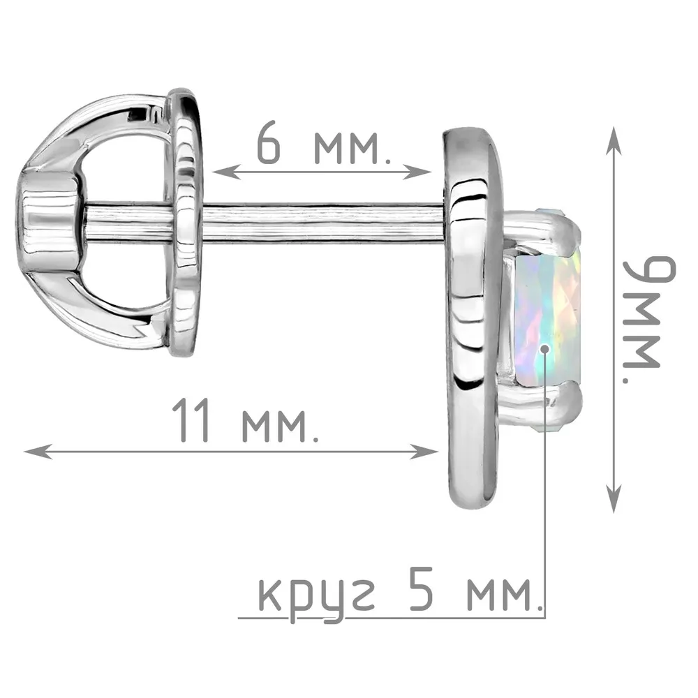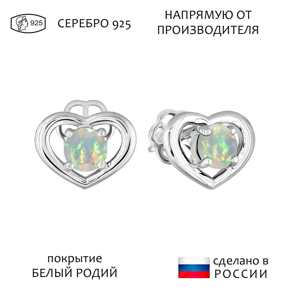Серебряные серьги гвоздики (пусеты) с натуральным опалом (Экстра) - Сердце / покрытие Белый Родий.
