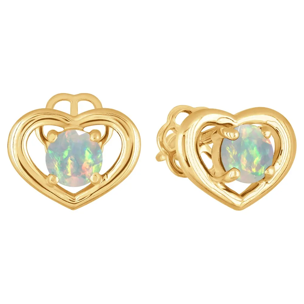Серебряные серьги гвоздики (пусеты) с натуральным опалом (Экстра) - Сердце / покрытие Желтое Золото.