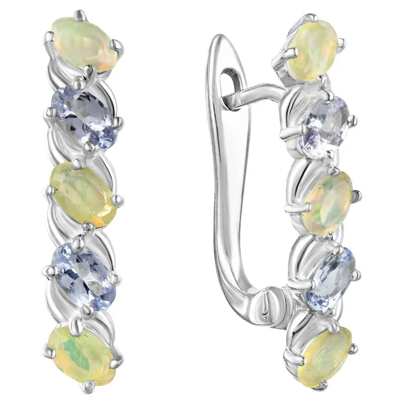 Серебряные серьги с натуральными камнями опал и танзанит - коллекция Колосок / Без покрытия