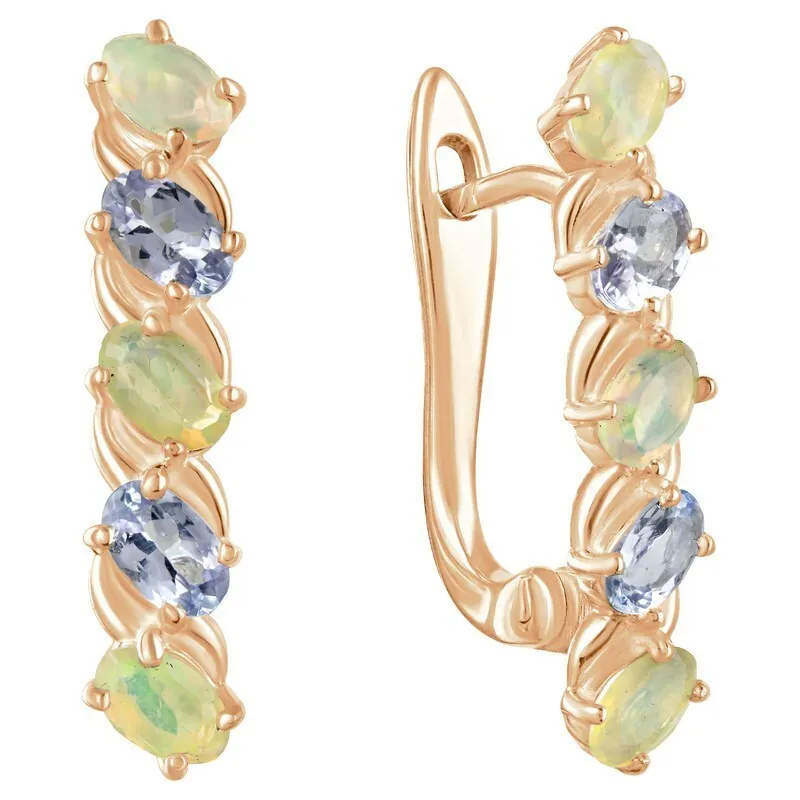 Серебряные серьги с натуральными камнями опал и танзанит - коллекция Колосок. Серебряные серьги 925 пробы с покрытием розовое золото. Цвет покрытия соответствует швейцарскому цветовому стандарту NIHS -4N и цвету розового золота 585 в России. На последней фотографии мы разместили сравнительную фотографию 3 цвета золотого покрытия. Помимо предания золотого цвета Вашему изделию, тонкий слой золота защищает от окисления. Для более стойкого эффекта золочения и долговечности покрытия мы дополнительно наносим подслой палладия (Pd). Средний вес изделия с камнями 4.3 гр. Месторождения: Опал (Эфиопия) и Танзанит (провинция Аруша, Танзания) Опал (Натуральный) овал 3*5 мм., средний вес: 0.15 карат. Танзанит (Натуральный) овал 3*5 мм., средний вес: 0.24 карат. Все изделия собственного производства. Гарантия 12 месяцев.Арт. 8032. Опал – это благородный камень, известный ещё с древности. Ему приписывали разнообразные магические свойства. Окраска опала многовариантна, выделяют более ста типов. Он помогал справиться с порчей и сглазом, защищал от негативной энергетики, способствовал излечению мигреней. Как талисман для ребенка, становился защитником от дурных сил и заболеваний.