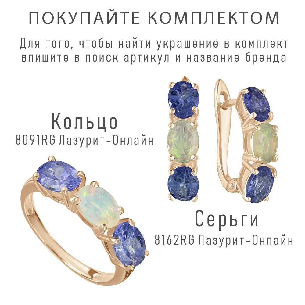 Серебряные серьги с натуральными камнями танзанит и опал - коллекция Муза. Серебряные серьги 925 пробы с покрытием красное золото. Цвет покрытия соответствует швейцарскому цветовому стандарту NIHS -5N и цвету красного золота 585 в России. На последней фотографии мы разместили сравнительную фотографию 3 цвета золотого покрытия. Помимо предания золотого цвета Вашему изделию, тонкий слой золота защищает от окисления. Для более стойкого эффекта золочения и долговечности покрытия мы дополнительно наносим подслой палладия (Pd). Средний вес изделия с камнями 4.02 гр. Месторождения: Танзанит (провинция Аруша, Танзания) и Опал (Эфиопия) Танзанит (Натуральный) овал 5*7 мм., средний вес: 0.89 карат. и Опал (Натуральный) овал 5*7 мм., средний вес: 0.46 карат. Все изделия собственного производства. Гарантия 12 месяцев.Арт. 8162. Опал – это благородный камень, известный ещё с древности. Ему приписывали разнообразные магические свойства. Окраска опала многовариантна, выделяют более ста типов. Он помогал справиться с порчей и сглазом, защищал от негативной энергетики, способствовал излечению мигреней. Как талисман для ребенка, становился защитником от дурных сил и заболеваний.