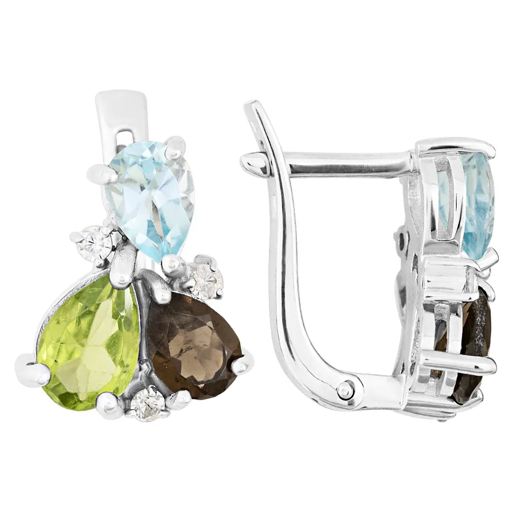 Серебряные серьги "Капель" с натуральными камнями хризолит, голубой топаз Sky и раухтопаз, без покрытия. Средний вес украшения с камнями 5,62 гр. Месторождение(я) камней: Хризолит (Якутия, Россия) , Топаз (Ильменские горы, Россия), Раухтопаз (Дымчатый кварц) (м-ние Додо ХМАО, Россия). Хризолит (Натуральный) груша: 6*9 мм., средний вес 1,00 карат. Раухтопаз (Натуральный) груша: 5*7 мм., средний вес 0,70 карат. Топаз (Натуральный) груша: 5*7 мм., средний вес 0,80 карат.