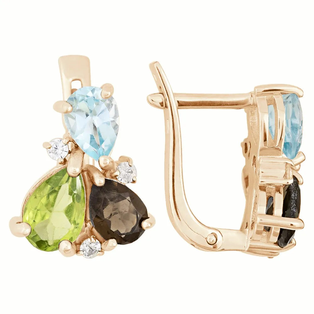 Серебряные серьги "Капель" с натуральными камнями хризолит, голубой топаз Sky и раухтопаз, покрытие Розовое Золото. Средний вес украшения с камнями 5,62 гр. Месторождение(я) камней: Хризолит (Якутия, Россия) , Топаз (Ильменские горы, Россия), Раухтопаз (Дымчатый кварц) (м-ние Додо ХМАО, Россия). Хризолит (Натуральный) груша: 6*9 мм., средний вес 1,00 карат. Раухтопаз (Натуральный) груша: 5*7 мм., средний вес 0,70 карат. Топаз (Натуральный) груша: 5*7 мм., средний вес 0,80 карат.