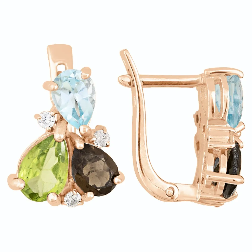 Серебряные серьги "Капель" с натуральными камнями хризолит, голубой топаз Sky и раухтопаз, покрытие Красное Золото. Средний вес украшения с камнями 5,62 гр. Месторождение(я) камней: Хризолит (Якутия, Россия) , Топаз (Ильменские горы, Россия), Раухтопаз (Дымчатый кварц) (м-ние Додо ХМАО, Россия). Хризолит (Натуральный) груша: 6*9 мм., средний вес 1,00 карат. Раухтопаз (Натуральный) груша: 5*7 мм., средний вес 0,70 карат. Топаз (Натуральный) груша: 5*7 мм., средний вес 0,80 карат.