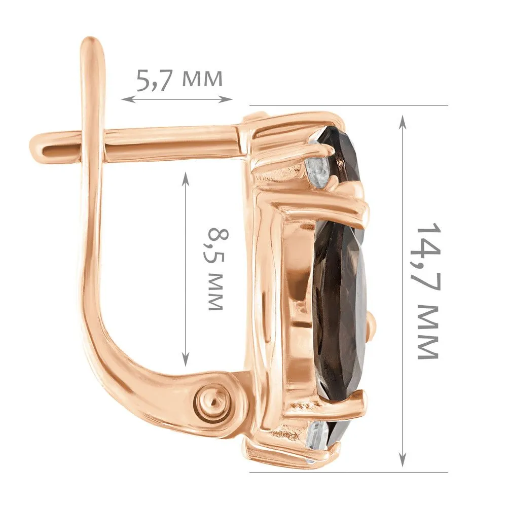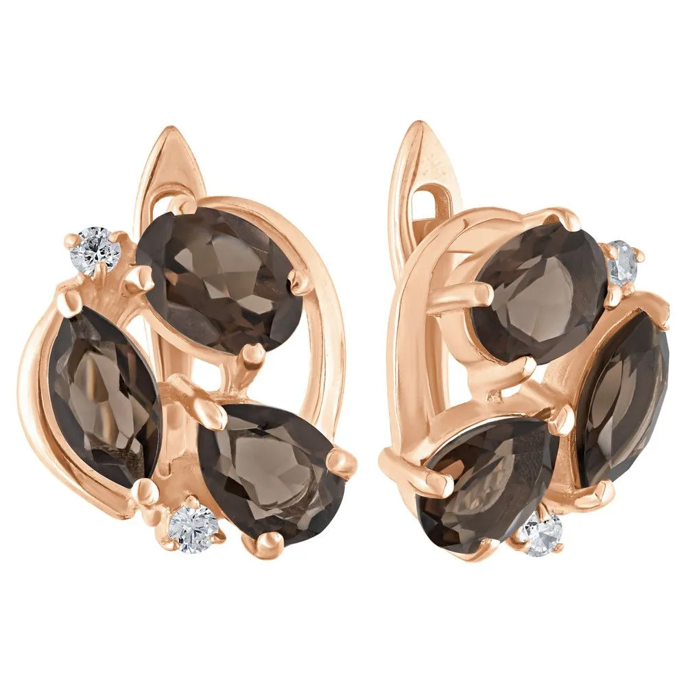 Серебряные серьги с натуральным раухтопазом - коллекция Фортуна / покрытие Красное золото. Средний вес украшения с камнями 5.68 гр. Месторождение: Раухтопаз (Дымчатый кварц) (м-ие Додо ХМАО, Россия) Ювелирные вставки: Раухтопаз (Натуральный) груша 5*7 мм., средний вес: 0.63 карат. Раухтопаз (Натуральный) овал 5*7 мм., средний вес: 0.75 карат. (Натуральный) круг 2 мм., средний вес: 0.06 карат. Все изделия собственного производства и имеют гарантию 12 месяцев. Арт. 8775RG . Раухтопаз – это разновидность кварца. Ранее он использовался в ювелирных украшениях, при вышивке картин, для магических ритуалов. Его влияние на владельца сразу становится заметно — человек успокаивается и становится рассудительным, легче выходит из депрессивных состояний. Часто использовался в приворотах, заговорах или для связи с миром духов.
