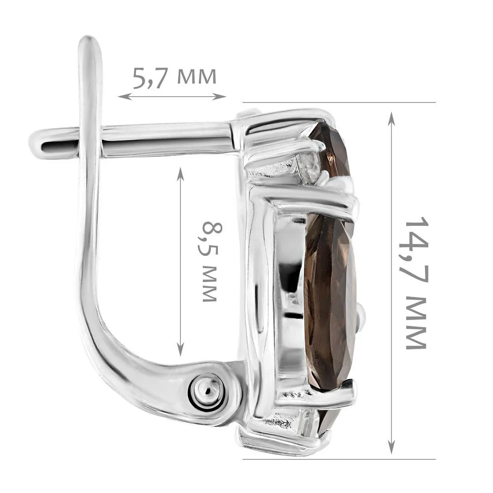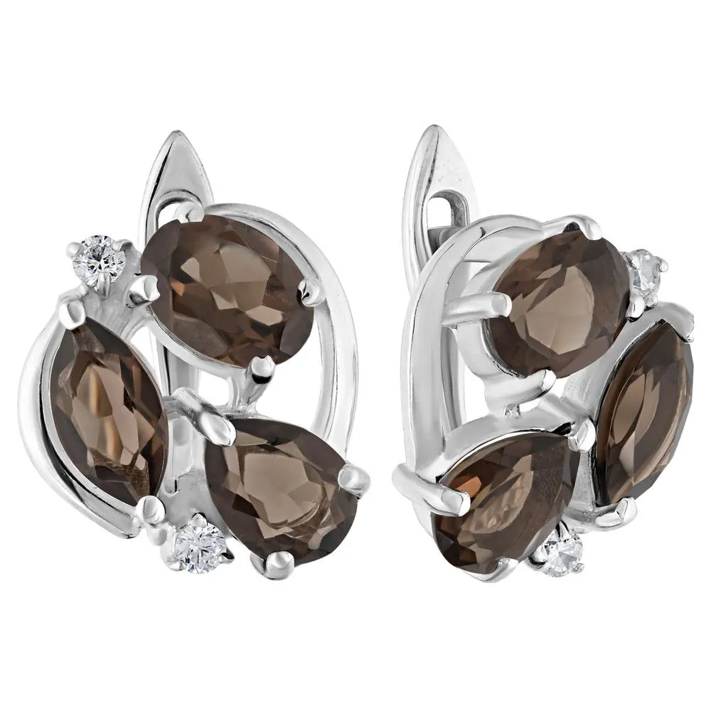 Серебряные серьги с натуральным раухтопазом - коллекция Фортуна / покрытие Белый Родий. Средний вес украшения с камнями 5.79 гр. Месторождение: Раухтопаз (Дымчатый кварц) (м-ие Додо ХМАО, Россия) Ювелирные вставки: Раухтопаз (Натуральный) груша 5*7 мм., средний вес: 0.63 карат. Раухтопаз (Натуральный) овал 5*7 мм., средний вес: 0.75 карат. (Натуральный) круг 2 мм., средний вес: 0.06 карат. Все изделия собственного производства и имеют гарантию 12 месяцев. Арт. 8775WR . Раухтопаз – это разновидность кварца. Ранее он использовался в ювелирных украшениях, при вышивке картин, для магических ритуалов. Его влияние на владельца сразу становится заметно — человек успокаивается и становится рассудительным, легче выходит из депрессивных состояний. Часто использовался в приворотах, заговорах или для связи с миром духов.